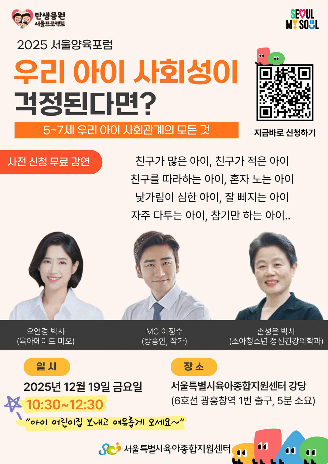 [맘스커리어 = 김혜원 엄마기자] 서울특별시육아종합지원센터가 주최한 ‘2025 양육 포럼’이 19일 오전 10시 30분, 서울특별시육아종합지원센터 강당에서 열렸다. 포럼 주제는 ‘우리 아이 사회관계의 모든 것’으로, 5~7세 미취학 아동을 양육하는 보호자를 대상으로 했다. 이번 포럼은 사전에 접수된 질문과 현장 질의를 중심으로 전문가가 직접 답하는 방식으로 진행됐다.