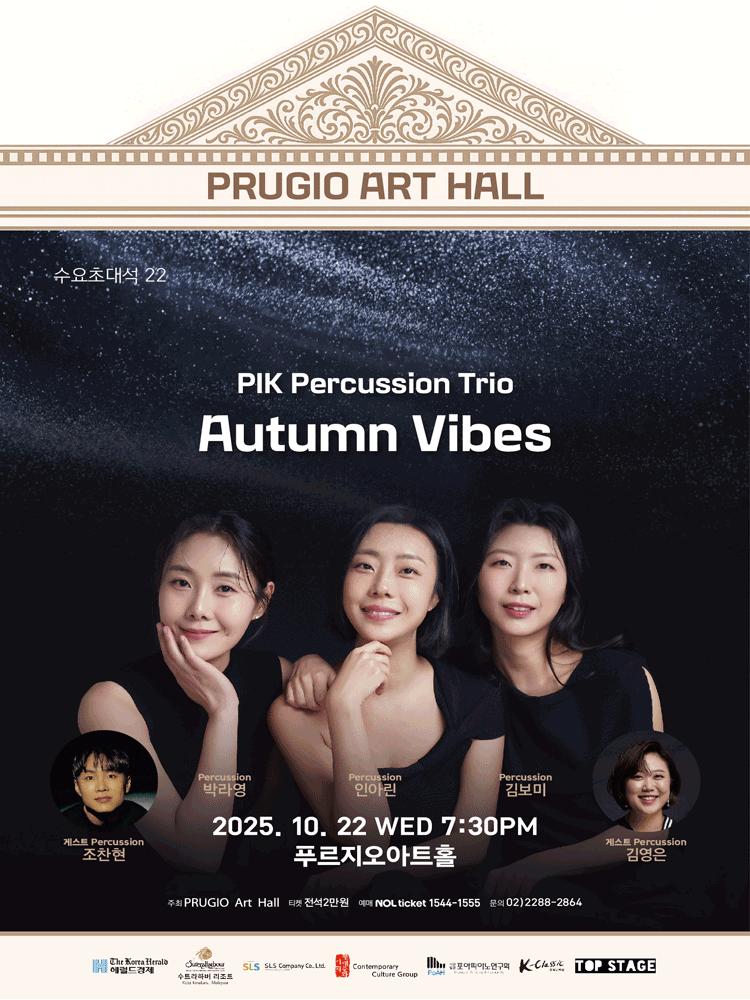 [맘스커리어 = 김보미 엄마기자] PIK 타악기 트리오가 오는 22일 오후 7시 30분 푸르지오아트홀 수요초대석 무대에 올라 공연 'Autumn Vibes'를 선보인다. 이번 공연은 깊이 있는 클래식 타악기 음악과 대중적인 매력을 동시에 담아낸 무대로 가을밤 관객들에게 진한 울림을 선사할 예정이다.