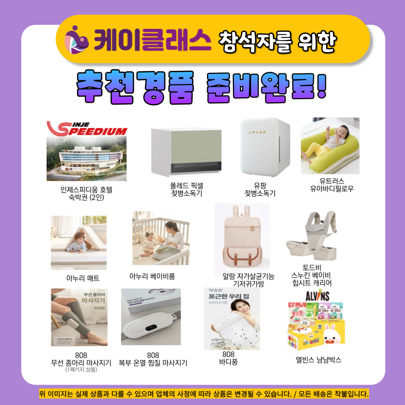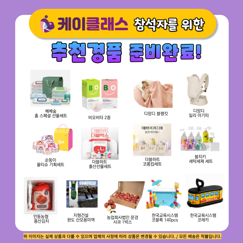 라이브 참가자를 대상으로 하는 실시간 경품 추첨도 준비돼 있다. 추첨 경품으로는 △인제스피디움 호텔 숙박권(2인) △폴레드 픽셀 젖병소독기 △유팡 젖병소독기 △유트러스 유아바디필로우 △아누리 베이비룸 △아누리 매트 △에프몬드 알랑 자가살균 기저귀 가방 △토드비 스누킨 베이비 힙시트 캐리어 △808스토어 바디풍 △808스토어 무선 공기압 온열 종아리 마사지기 △808스토어 복부 온열 찜질 마사지기 △엘빈즈 냠냠박스 △순둥이 물티슈 감사선물세트 △베베숲 물티슈 선물세트 △일동생활건강 비오비타 2종 △디망디 블랭킷 △디망디 일리 아기띠 △더블하트 출산선물세트 △더블하트 코롱 컵 세트 △붐치키 세탁세제 세트 △안동농협 풍산김치 △완도 자연산 돌미역(지형건설 후원) △농업회사법인 문경 사과 1박스 △한국교육시스템 코블록 140pcs △한국교육시스템 코레카 등이 마련됐다.