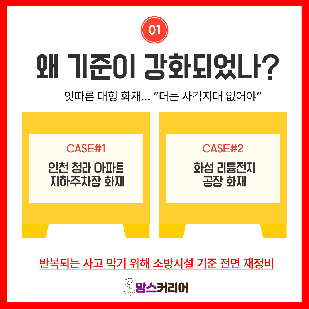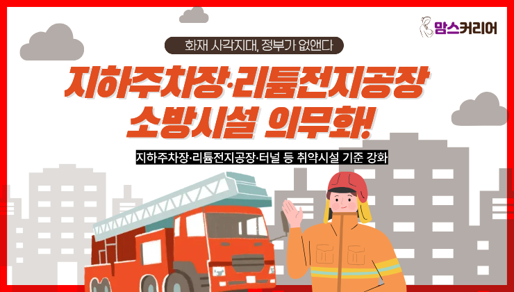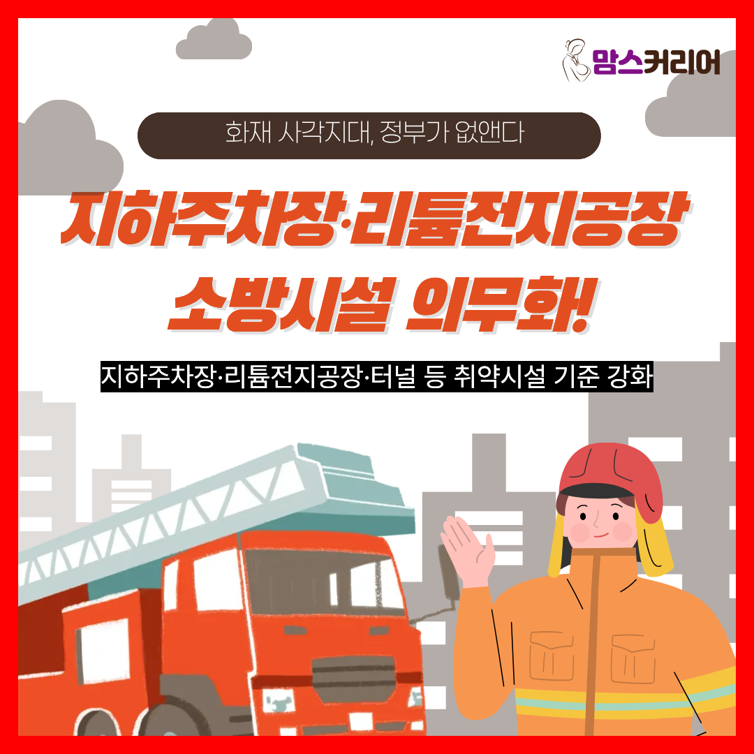 [맘스커리어 = 최영하 기자] 소방청은 소규모 지하주차장과 리튬전지공장 등 화재 취약시설의 안전성을 높이기 위해 소방시설 설치 기준을 대폭 강화한다고 밝혔다.