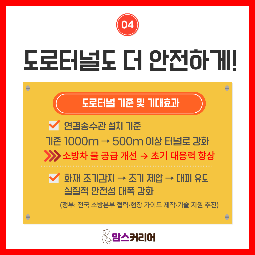 또한 도로터널의 경우 소방차의 물을 터널 내부로 보낼 수 있는 연결송수관설비의 설치 기준을 기존 길이 1000m 이상에서 500m 이상으로 확대한다.