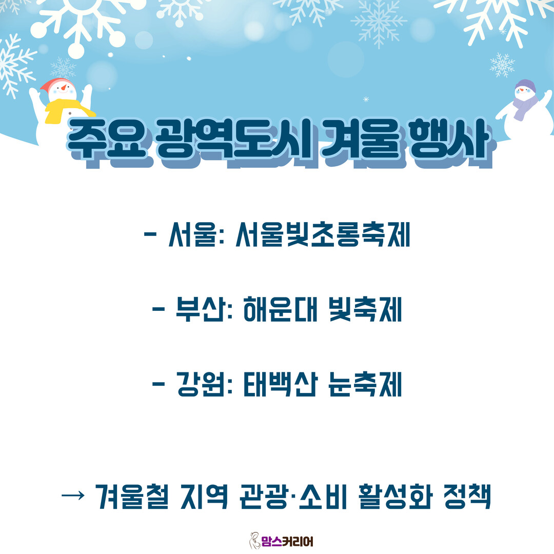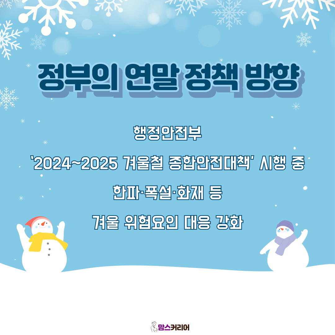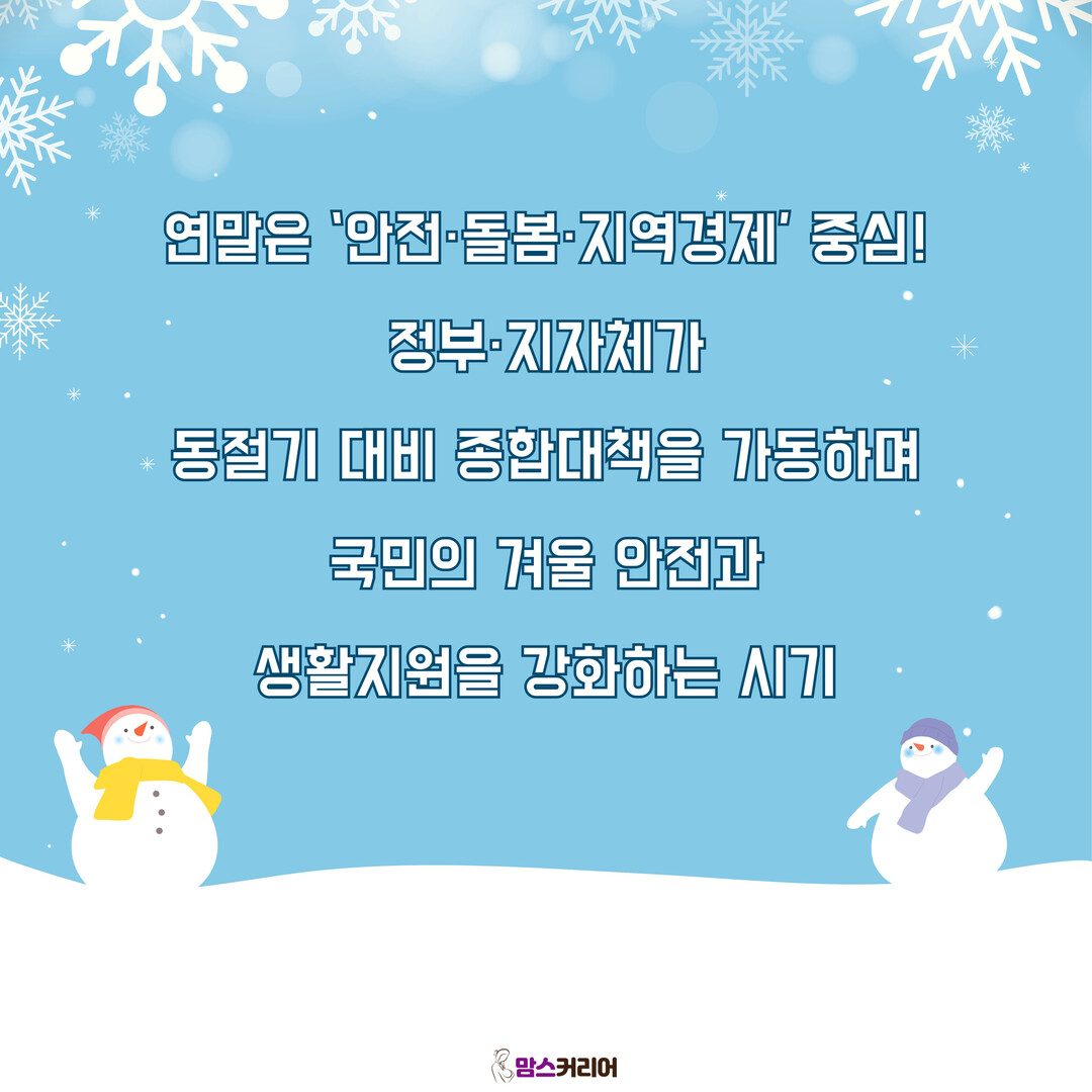 [맘스커리어 = 최영하 기자] 연말을 앞두고 정부와 지방자치단체가 겨울철 안전관리, 취약계층 지원, 지역경제 활성화 등 다양한 분야에서 연말·연초 종합 대책을 시행하고 있다. 이는 12월 기온 하락과 연말 이동량 증가, 동절기 취약계층 보호 필요성 등에 따른 조치다.