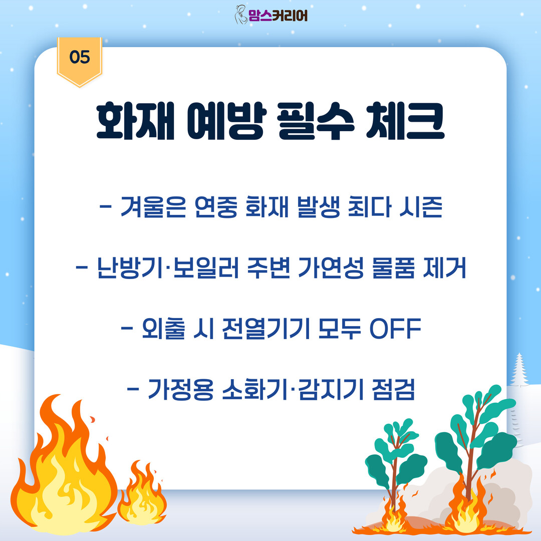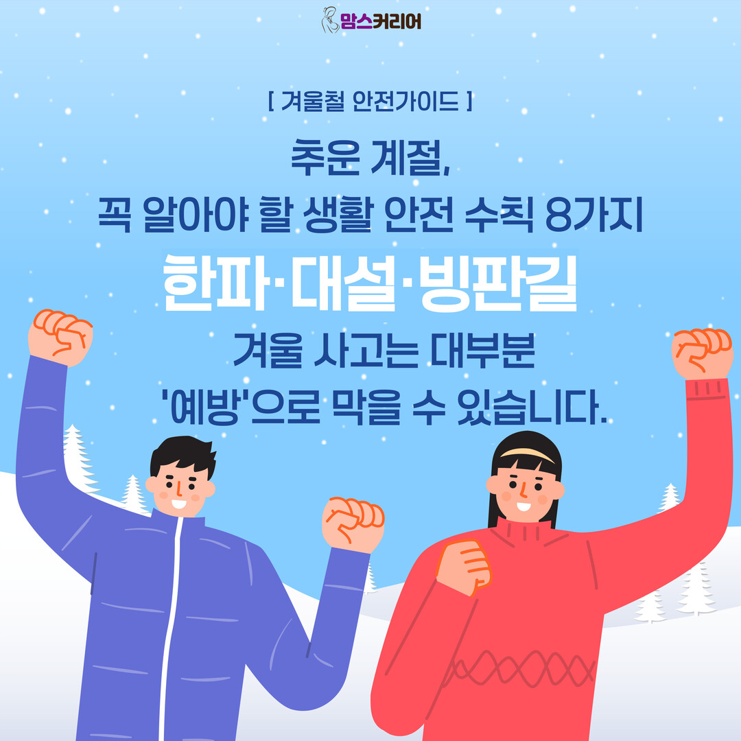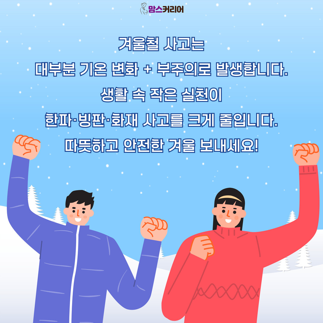[맘스커리어 = 최영하 기자] 겨울철에는 기온 하강과 강설, 결빙 등으로 일상 속 안전사고 위험이 크게 높아진다. 빙판길 보행 중 넘어짐 사고, 눈길 차량 미끄러짐 사고, 난방기기 사용 증가에 따른 화재 위험까지 겹치며 겨울철은 어느 계절보다 각별한 주의가 필요한 시기로 꼽힌다. 특히 한파가 잦아지는 시기에는 작은 부주의 하나가 큰 사고로 이어질 수 있어, 사전 예방과 안전 수칙 준수가 더욱 중요해지고 있다.