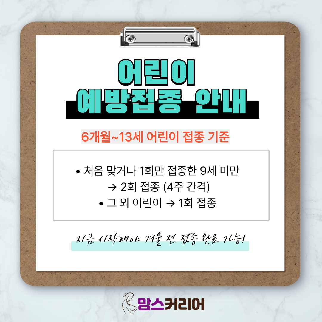 질병청은 현재 '25-26절기 인플루엔자 국가예방접종'을 시행 중이다. 접종 대상은 생후 6개월~13세 어린이(2012.1.1~2025.8.31. 출생자), 임신부, 65세 이상 어르신(1960.12.31. 이전 출생자)이다. 생후 6개월 이상 13세 어린이 중 과거 접종력이 없거나 기존에 1회만 접종 받은 6개월 이상 9세 미만 유아·어린이는 2회 접종 대상이며 위 조건 이외의 어린이는 1회 접종 대상이다.