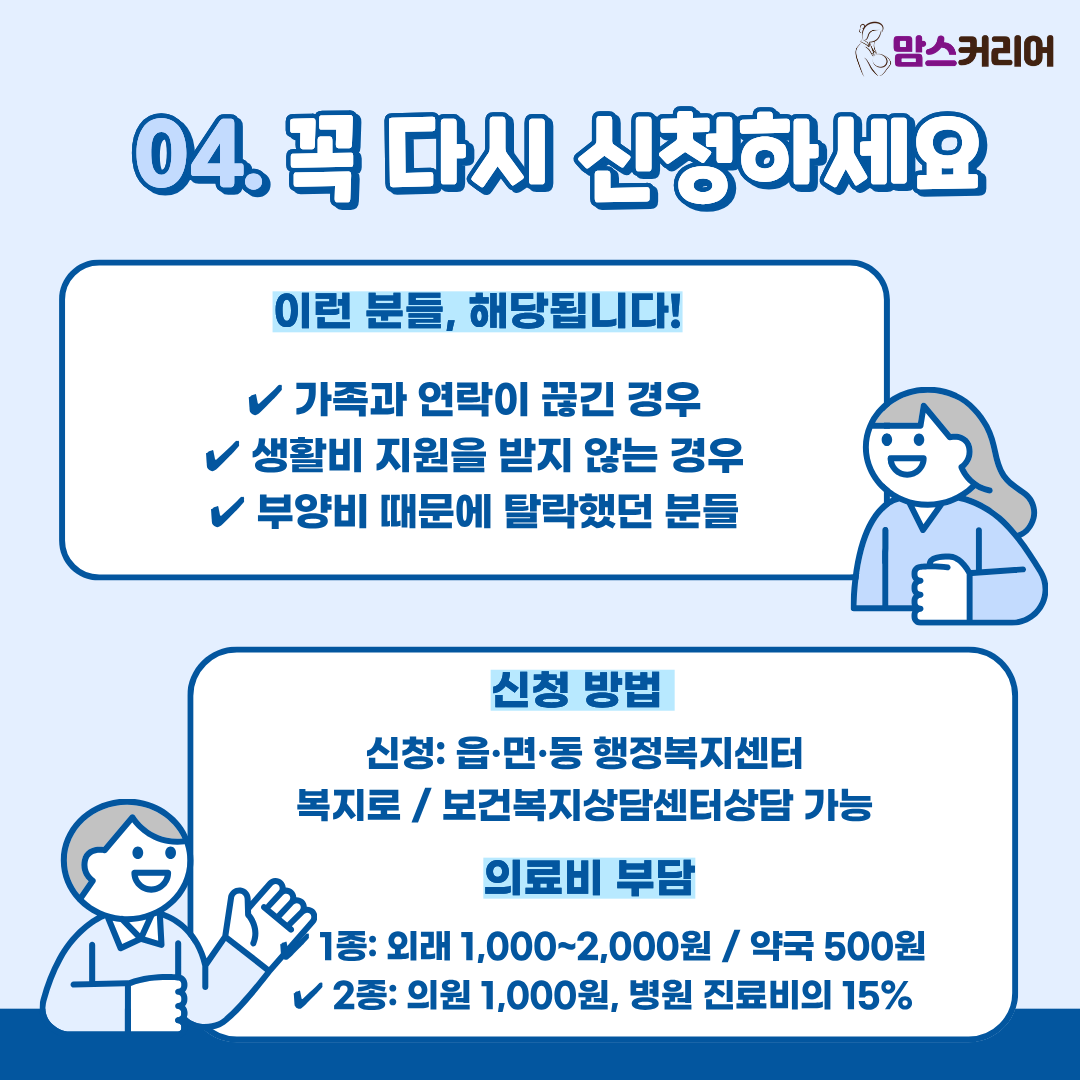 앞으로는 실제 받는 소득만 기준으로 의료급여를 심사해, 가족과 연락이 끊겼거나 지원을 받지 않는 사람들도 수급 혜택을 받을 수 있게 된다. 다만 부양의무자가 고소득·고재산일 경우 제한이 있을 수 있으며, 신청은 거주지 읍·면·동 행정복지센터에서 가능하다.