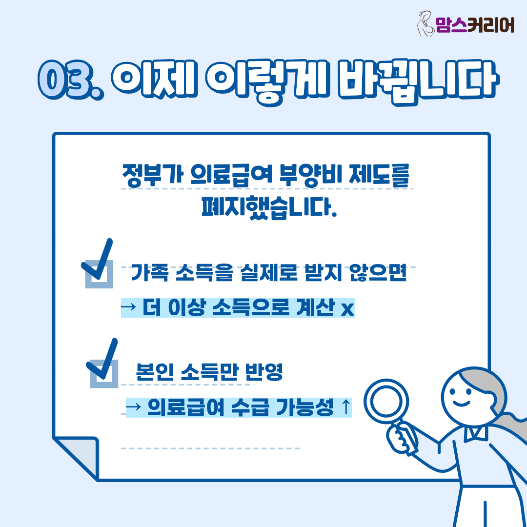 [맘스커리어 = 최영하 기자] 의료급여는 저소득층의 의료비를 지원하는 제도지만, 그동안은 실제로 지원하느냐와 상관없이 소득이 있는 가족이 있으면 못 받는 경우가 적지 않았다.