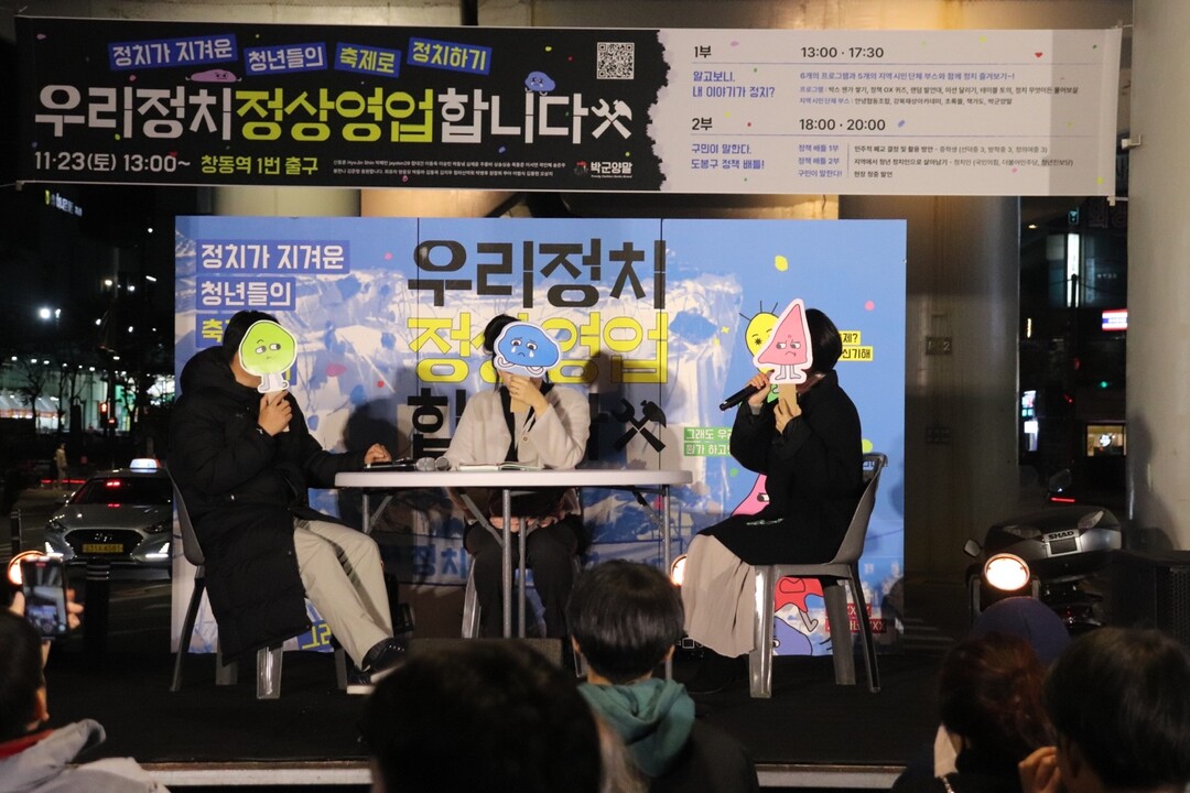 기획단은 지난 11월 23일 도봉구 창동역 1번 출구에서 ‘우리 정치 정상 영업합니다’를 주제로 정치 페스티벌을 열었다. 도봉구에 사는 청년들이 모여 우리 사회가 정치·사회에 관심을 가질 수 있는 방법을 고민하다가 페스티벌의 형태로 기획한 것. 페스티벌은 총 2부로 나눠 ▲알고 보니, 내 이야기가 정치?(1부) ▲구민이 말한다, 도봉구 정책 배틀(2부)로 진행됐고, 특히 청년의 지역정치 참여 활성화 방안을 다룬 ‘지역에서 청년 정치인으로 살아남기’에서는 이동학 더불어민주당 전 최고위원, 정혜림 국민의힘 상근부대변인, 홍희진 청년진보당 대표가 참여해 특정 정당에 치우치지 않는 ‘정치’ 자체를 알리는 데 집중했다. 행사 현장에는 500여 명의 시민들이 방문하며 뜨거운 관심을 보였다.