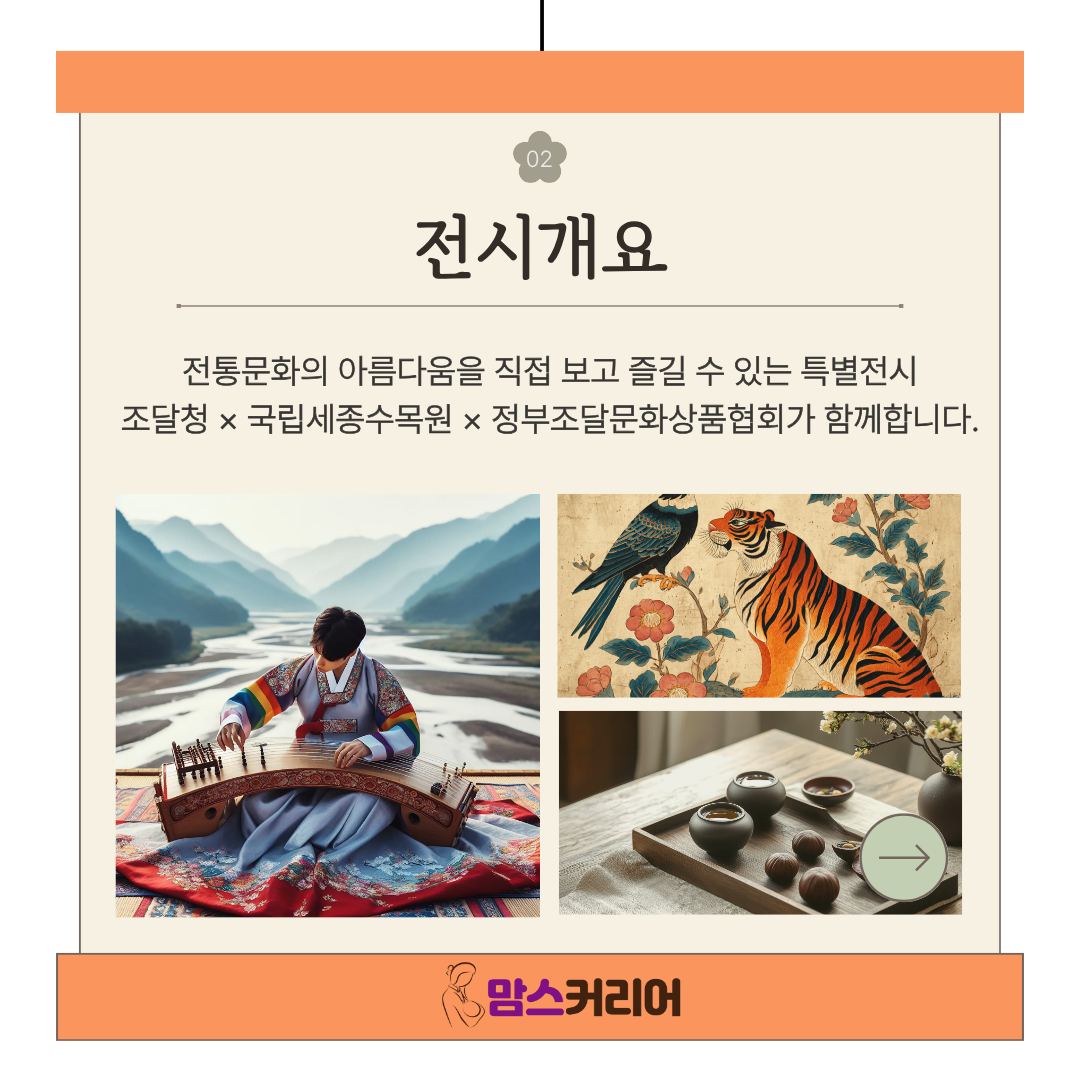 [맘스커리어 = 최영하 기자] 조달청은 국립세종수목원, (사)정부조달문화상품협회와 함께 이달 14일부터 26일까지 국립세종수목원 분재문화관에서 ‘우리 문화의 숨결’ 특별전시를 개최한다. 이번 전시는 정부조달 문화상품을 국민에게 널리 알리고, 가을 정취 속에서 전통문화를 직접 보고 즐기며 체험할 수 있도록 마련됐다.