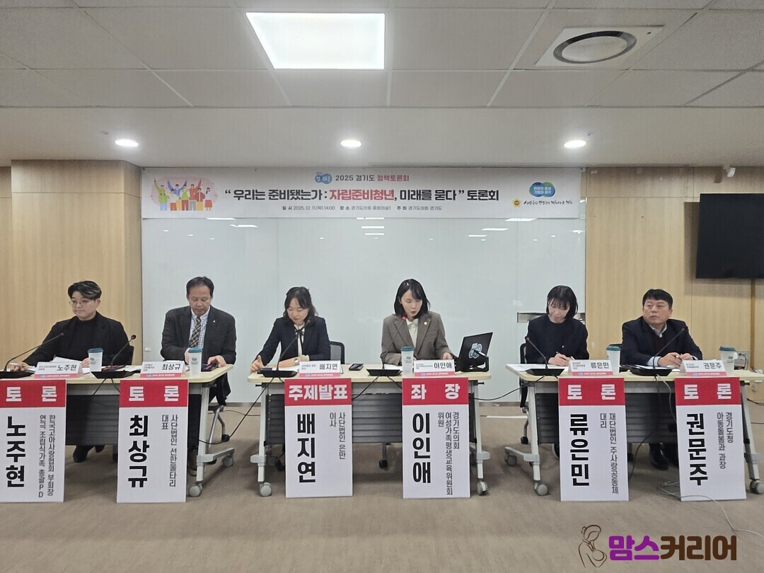 [맘스커리어 = 김보미 엄마기자] '우리는 준비됐는가: 자립준비청년, 미래를 묻다'를 주제로 한 2025 경기도 정책토론회가 11일 오후 2시 경기도의회 중회의실1에서 열렸다. 이번 토론회는 경기도와 경기도의회가 공동으로 주최하고 이인애 경기도의회 여성가족평생교육위원회 위원이 좌장을 맡아 진행됐다.