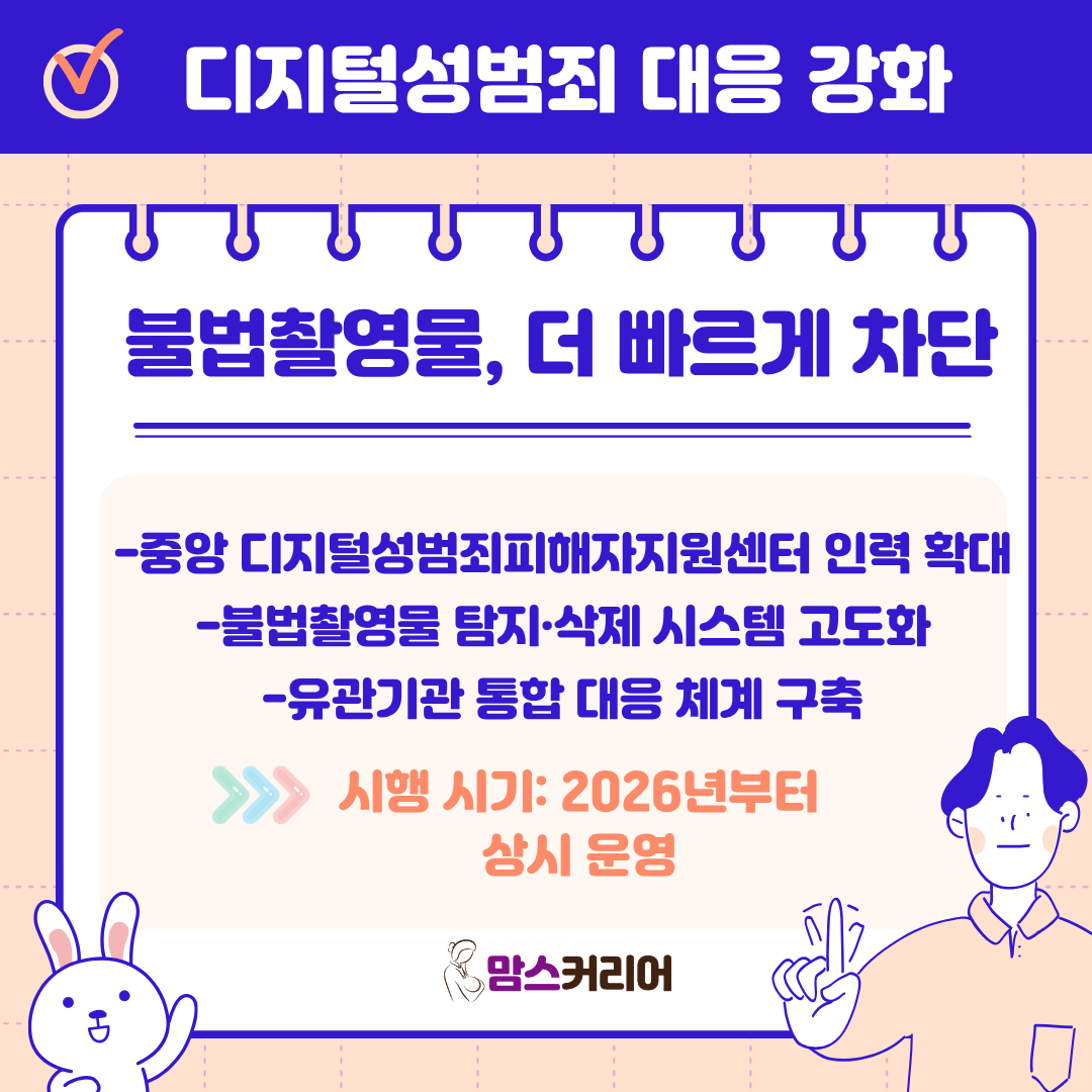 [맘스커리어 = 최영하 기자] 올해부터 아이돌봄서비스 지원이 확대되고, 취약위기가족 발굴도 강화된다. 또한 디지털성범죄로부터 모두를 빈틈없이 보호·지원하고자 중앙 디지털성범죄피해자지원센터 인력을 지난해 33명에서 올해 43명으로 10명 늘리고, 불법촬영물등 탐지·삭제지원 시스템도 고도화한다.