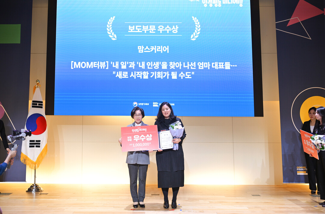 [맘스커리어 = 최영하 기자] 출산과 육아로 경력 단절을 겪었다가 다시 용감하게 일터로 나선 두 엄마의 이야기가 상을 받았다. 김혜원 맘스커리어 기자의 ‘[MOM터뷰] ’내 일‘과 ’내 인생‘을 찾아 나선 엄마 대표들… “새로 시작할 기회가 될 수도”’가 제27회 양성평등미디어상 보도 부문 우수상을 수상했다.