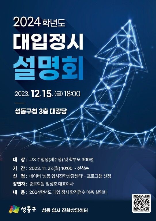 서울시 성동구는 15일 성동구청 3층 대강당에서 ‘2024학년도 대입 정시 설명회’를 개최한다. 국내 최고 입시전문가로 꼽히는 임성호 종로학원 대표가 연사로 참여해 올해 수능 총평과 대학별 예상 합격점수와 정시지원전략, 통합수능 3년차 입시 결과를 공개할 예정이다. 성동 입시진학상담센터 홈페이지'에서 신청할 수 있으며, 선착순 300명에게는 2024학년도 정시 배치표를 제공한다.