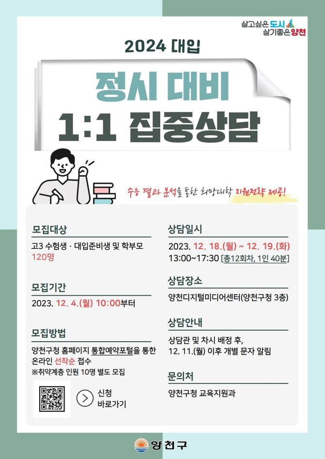 양천구, 정시대비 상담 진행해 [맘스커리어=김혜원 엄마기자] 지난 8일 수험생은 2024학년도 대학수학능력시험(수능) 성적표를 받아들었다. 올 수능은 킬러문항(초고난도 문항)을 배제했음에도 역대급 ‘불수능’이었다는 평을 받는다. 13일, 교육계에 따르면 올 수능은 국어, 수학, 영어가 지난해보다 어렵게 출제됐다. 절대평가인 영어는 1등급 비율이 4.71%에 불과해 지난해 1등급 비율인 7.83%에 비해 크게 줄었다. 수시 전형에서 각 대학이 요구하는 수능 최저학력기준을 충족하지 못해 불합격하는 수험생도 많이 늘어날 전망이다. 상황이 이렇다 보니 수험생과 학부모는 불안하기만 하다. 대입 정시 원서접수를 앞두고 수험생·학부모가 입시 컨설팅에 몰리고 있다. 과도한 비용 탓에 학부모의 부담이 높은 가운데 교육부는 시도교육청과 고액 교습비 수수 등 사교육업체의 편·불법 영리행위에 대한 특별점검을 실시한다. 공공 입시 상담을 강화하고자 정부와 지자체가 지원에 나섰다.