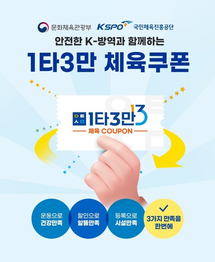 1타 3만 체육 쿠폰은 국민체육진흥공단이 문화체육관광부와 함께 실내 민간체육시설 이용 활성화를 위해 발행한 쿠폰이다. 일정 기간 동안 체육시설에서 8만 원 이상 결제하면 선착순으로 예산 소진 시까지 3만 원을 환급해 준다. 아이들이 많이 다니는 태권도·줄넘기·축구교실 등도 체육시설에 포함돼 발행 당시 엄마들 사이에서 인기가 높았다.