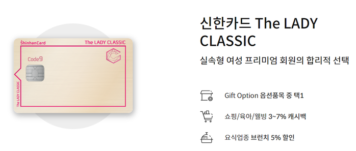 신한카드 The LADY CLASSIC을 이용하면 매달 교육비의 5%를 돌려받을 수 있다. 캐시백은 최대 5만 원으로, 한 달에 학원비 100만 원을 결제했을 때 1년이면 60만 원을 아낄 수 있다.