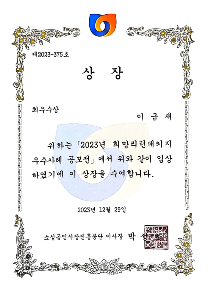 [맘스커리어=김보미 엄마기자] 맘스커리어가 소상공인시장진흥공단이 주최한 '2023년 희망리턴패키지 우수사례 공모'의 사업참여자 성공수기 부문에서 최우수상(소상공인시장진흥공단이사장상)을 수상했다.
