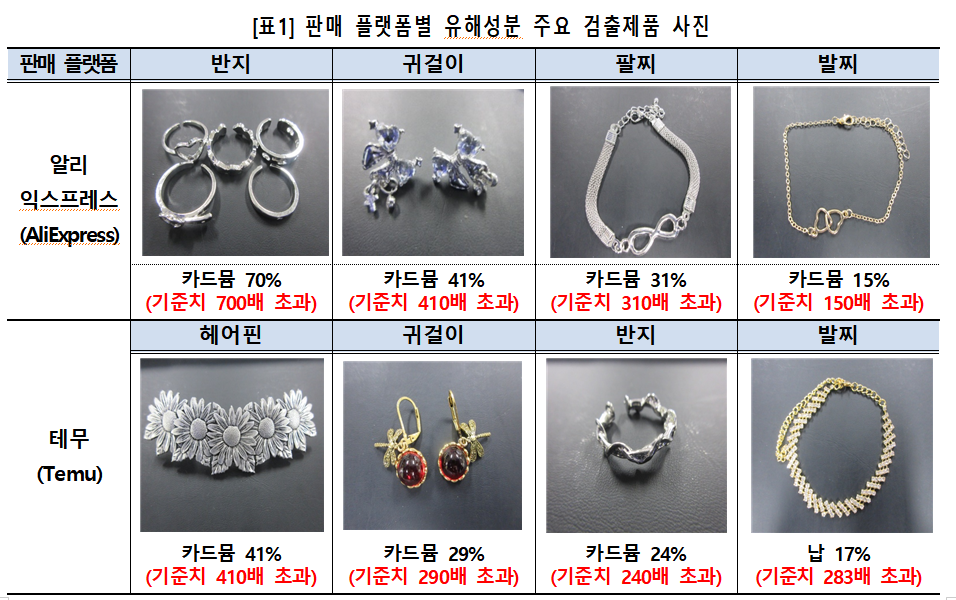발암물질이 검출된 장신구의 종류는 △귀걸이 47점(37%) △반지 23점(32%) △발찌 8점(20%) △헤어핀 4점(16%) △목걸이 10점(15%) △팔찌 4점(12%) 등이다. 알리익스프레스에서 판매된 제품 180점 중 48점(27%), 테무에서 판매된 제품 224점 중 48점(20%)에서 유해 물질이 검출됐다. 위 장신구들의 가격은 약 600원에서 4000원 사이인 것으로 알려졌다.