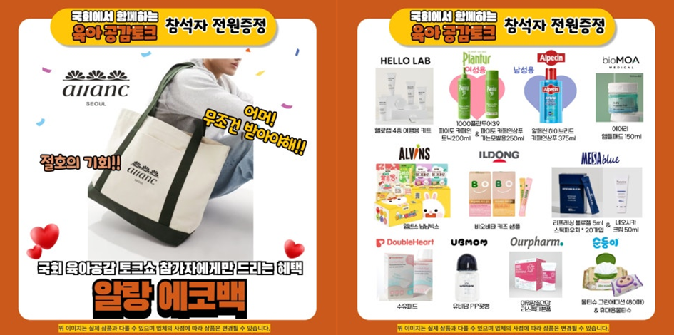 아울러 참가자 전원에게는 △일동후디스 트루맘박스 △알랑 에코백 △헬로랩 4종 여행용 키트 △1000플란투어39 파이토 카페인 토닉 200ml, 파이토 카페인샴푸 가는모발용 250ml △알페신 하이브리드 카페인 샴푸 375ml △에어리 앰플패드 150ml △엘빈즈 냠냠박스 △일동생활건강 비오비타 키즈 샘플 △메사블루 리프레싱 블루젤, 네오시카 크림 △더블하트 수유패드 △유비맘 PP젖병 △아워팜 질건강 리스펙타 △순둥이 물티슈 그린에디션, 휴대용 물티슈 등을 증정한다.