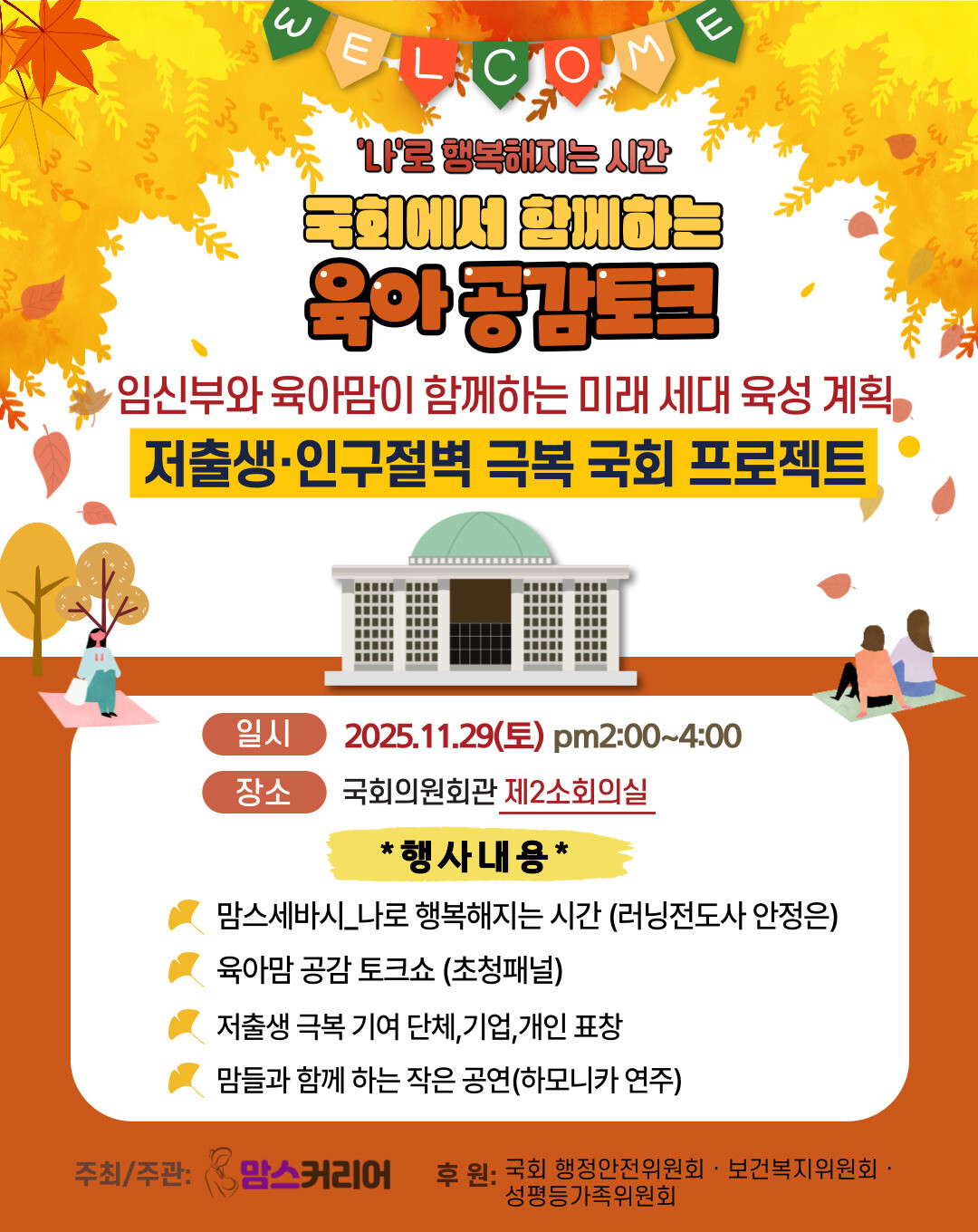 [맘스커리어 = 김보미 엄마기자] 저출생으로 인한 인구 절벽 시대, 미래세대 양육에 대한 공감과 해법을 모색하는 행사 '육아 공감토크'가 오는 29일 오후 2시부터 4시까지 국회의원회관 제2소회의실에서 열린다. 이번 행사는 '나로 행복해지는 시간'을 슬로건으로 아이를 품고 기르면서 엄마들이 느끼는 기쁨과 고충에 대해 논의하고 저출생 문제를 사회 전체의 과제로 바라보는 계기를 만들어 보자는 취지에서 마련됐다.