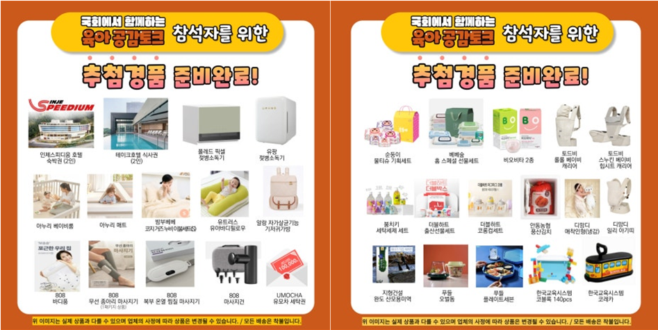 참여한 임산부, 육아맘들을 위한 푸짐한 경품도 마련된다. 이날 행사장에서는 추첨을 통해 △인제스피디움 호텔 숙박권(2인) △폴레드 픽셀 젖병소독기 △유팡 젖병소독기 △아누리 베이비룸 △아누리 매트 △밤부베베 코지 거즈 누비 이불세트(싱글) △유트러스 유아바디필로우 △에프몬드 알랑 자가살균 기저귀 가방 △808스토어 바디풍 △808스토어 무선 공기압 온열 종아리 마사지기 △808스토어 복부 온열 찜질 마사지기 △순둥이 물티슈 감사선물세트 △베베숲 물티슈 선물세트 △일동생활건강 비오비타 2종 △토드비 롤롤 베이비 캐리어 △토드비 스누킨 베이비 힙시트 캐리어 △붐치키 세탁세제 세트 △더블하트 출산선물세트 △더블하트 코롱 컵 세트 △안동농협 풍산김치 △디망디 블랭킷 △디망디 일리 아기띠 △완도 자연산 돌미역(지형건설 후원) △한국교육시스템 코블록 140pcs △한국교육시스템 코레카 △바이오모아메디칼 프롬더스킨 스킨케어 3종 △메사블루 스킨케어 3종 등이 제공될 예정이다.