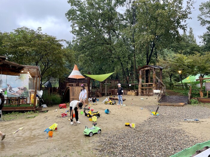 평소에 흙을 만져볼 기회가 많지 않은 아이들은 숲 놀이터 한편에 마련된 모래 놀이터를 보자마자 곧장 달려간다. 모래 놀이터에는 모래놀이 장난감과 곤충 모형·공룡 피규어·포클레인·소꿉놀이 등 아이들이 갖고 놀 수 있는 장난감이 준비돼 있다. 여기서는 사장님 주워놓으신 도토리·밤 등도 아이들의 장난감이 된다.