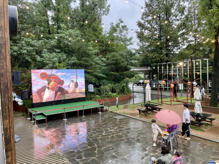 | ▲야외에 마련된 대형 스크린에서 영화를 상영하고 있다.[사진=김보미 기자] |