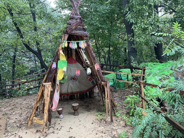 | ▲숲놀이터에는 나무로 만든 인디언텐트가 있다.[사진=김보미 기자] |