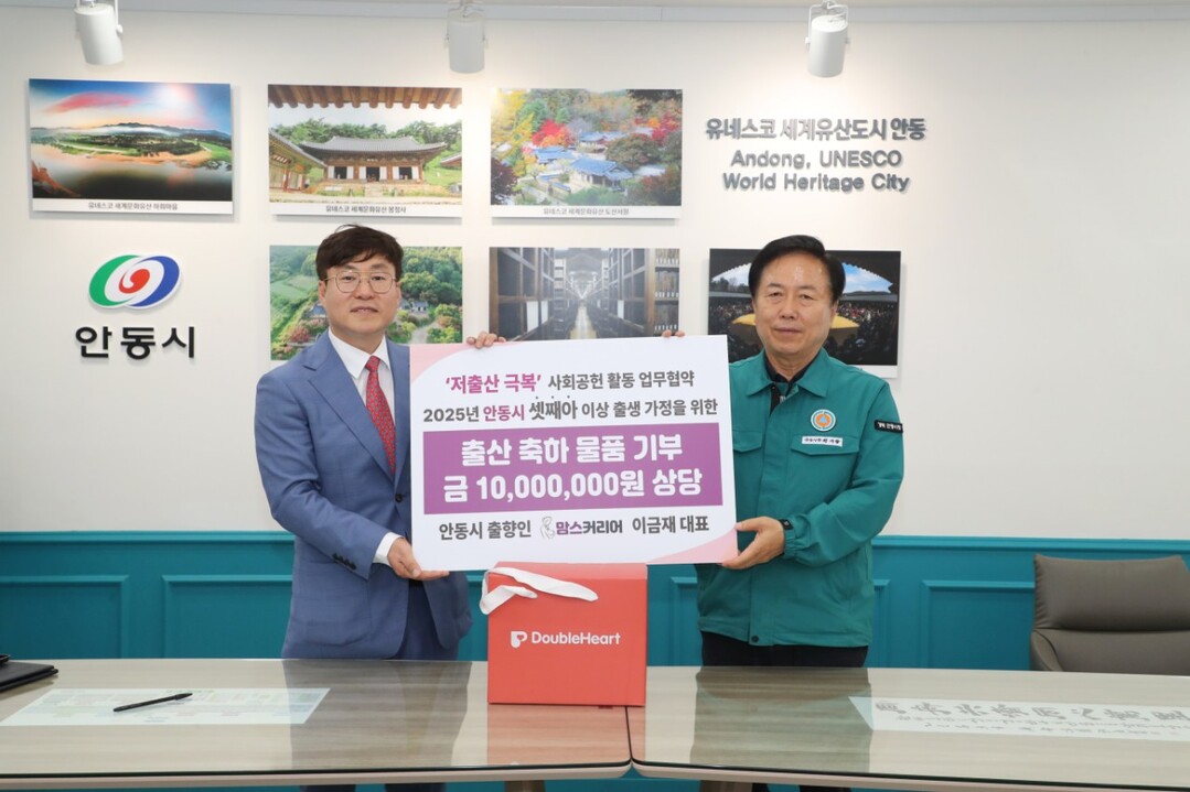 이번 협약에 따라 맘스커리어는 하반기부터 2025년도 안동시 셋째아 이상 출생 가정에 1박스당 17만 원 상당의 출산축하박스(더블하트 더블박스)를 기부한다. 출산축하박스에는 젖병, 수유패드, 신생아 스킨케어 제품 등 육아에 실질적으로 필요한 물품들이 담길 예정이다.