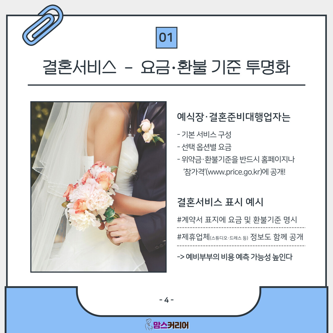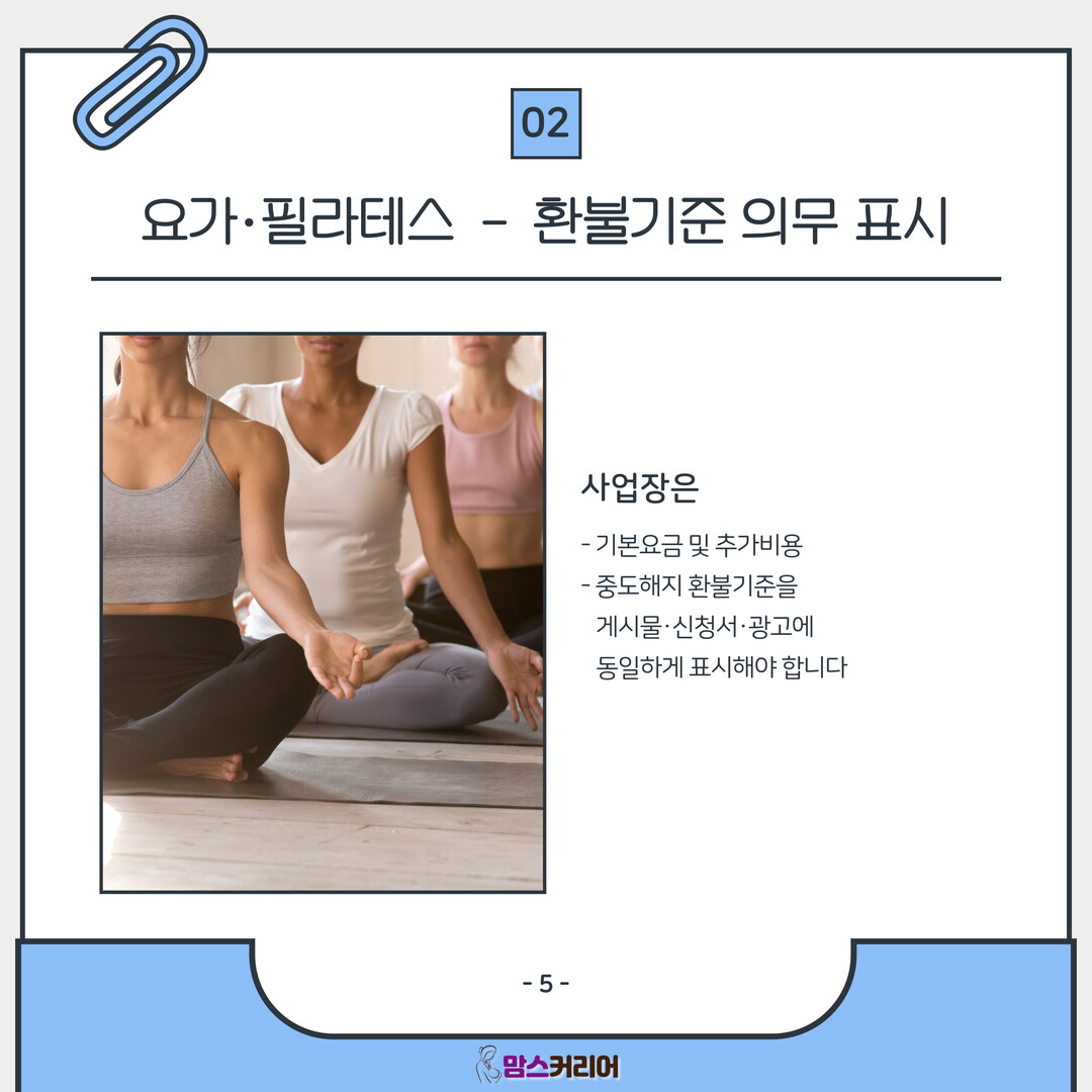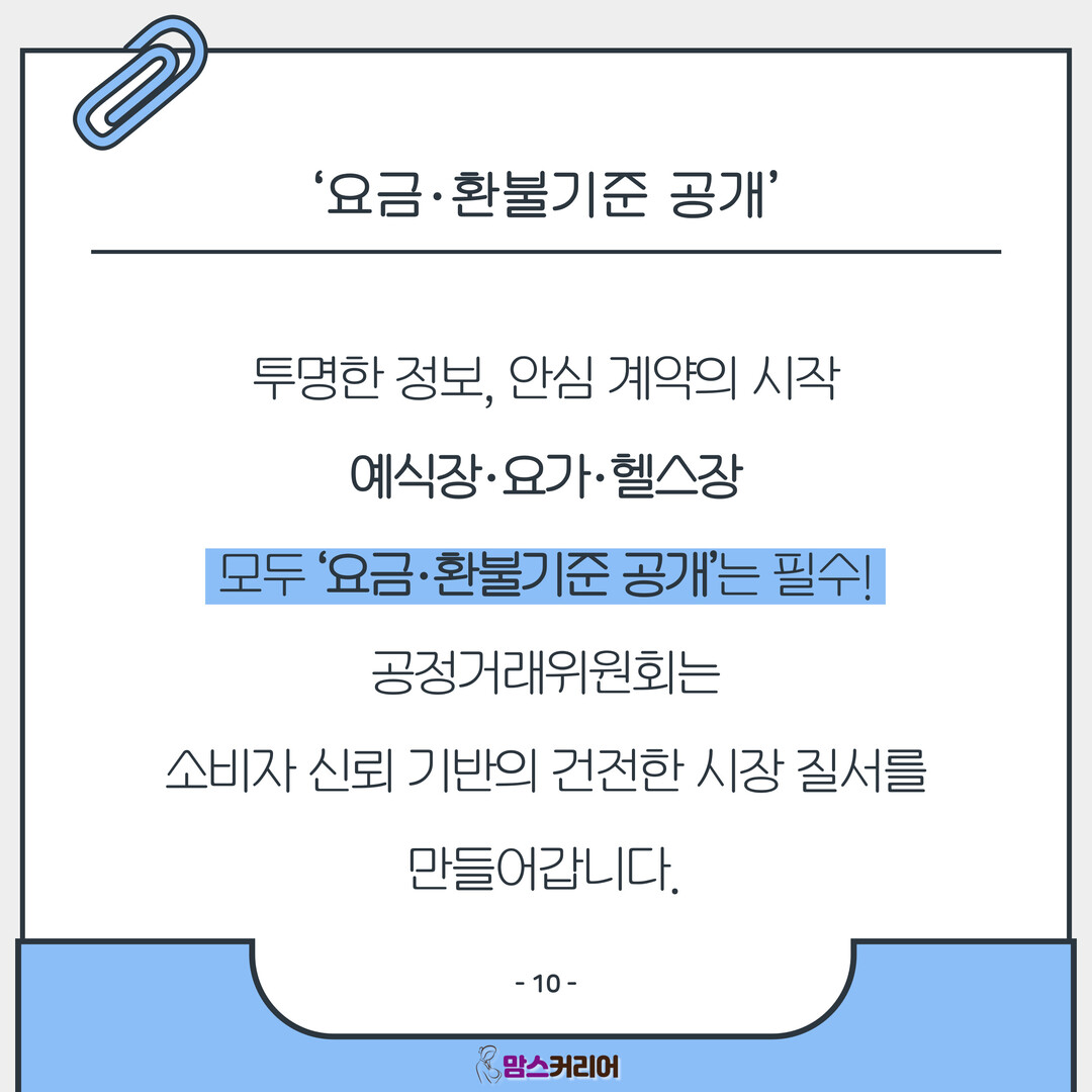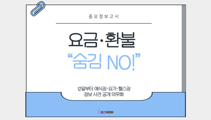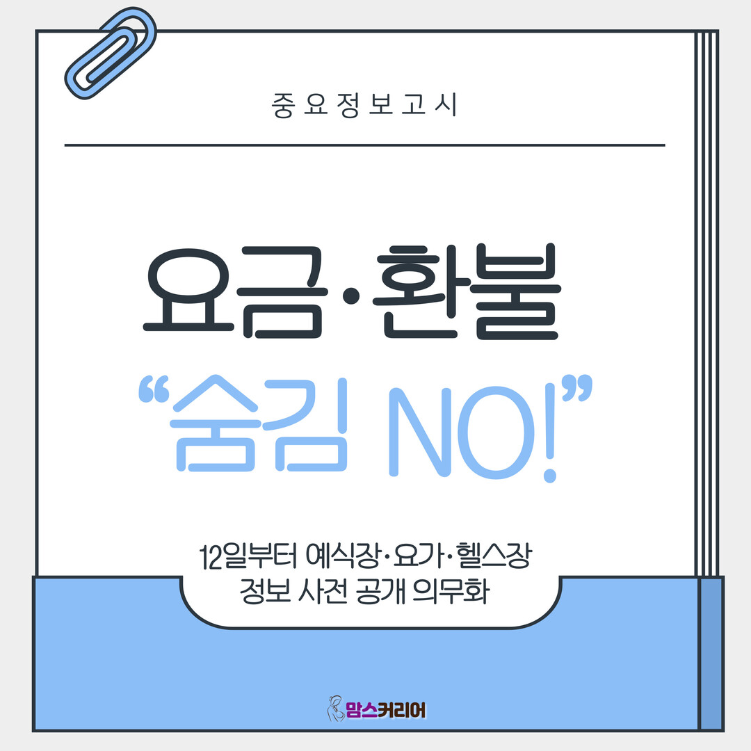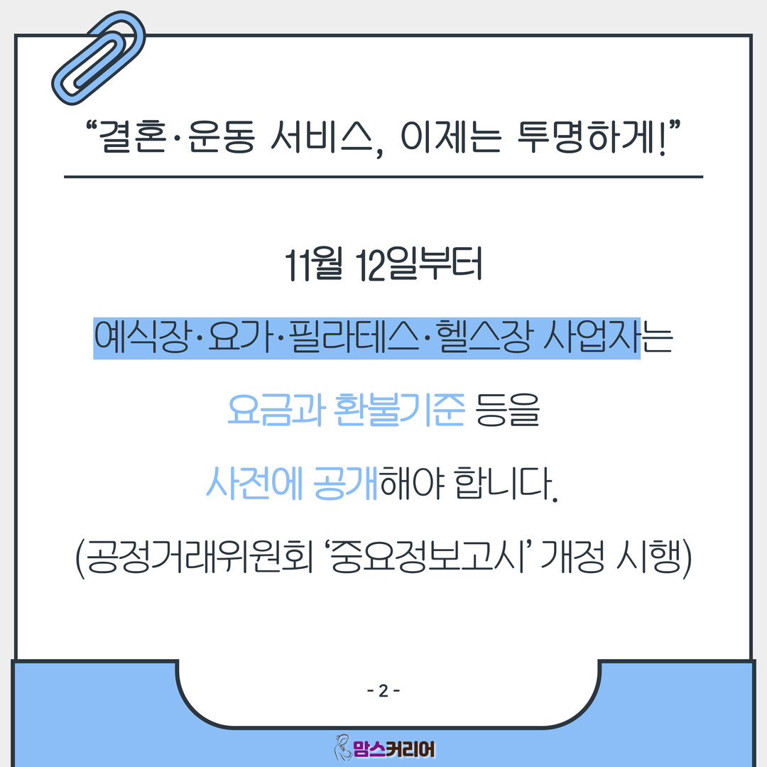 [맘스커리어 = 최영하 기자] 공정거래위원회는 '중요한 표시·광고사항 고시'(중요정보고시) 개정안을 이달 12일부터 시행한다고 밝혔다. 이에 따라 결혼서비스·요가·필라테스 사업자는 요금체계, 환급기준, 보증보험 가입 여부 등을 사전에 공개해야 한다.