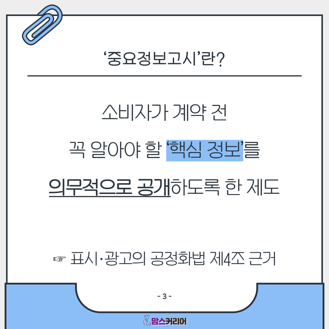 중요정보고시는 '표시·광고의 공정화에 관한 법률' 제4조에 따라 사업자가 소비자의 구매·이용 결정에 꼭 필요한 정보를 의무적으로 공개하도록 한 제도다.