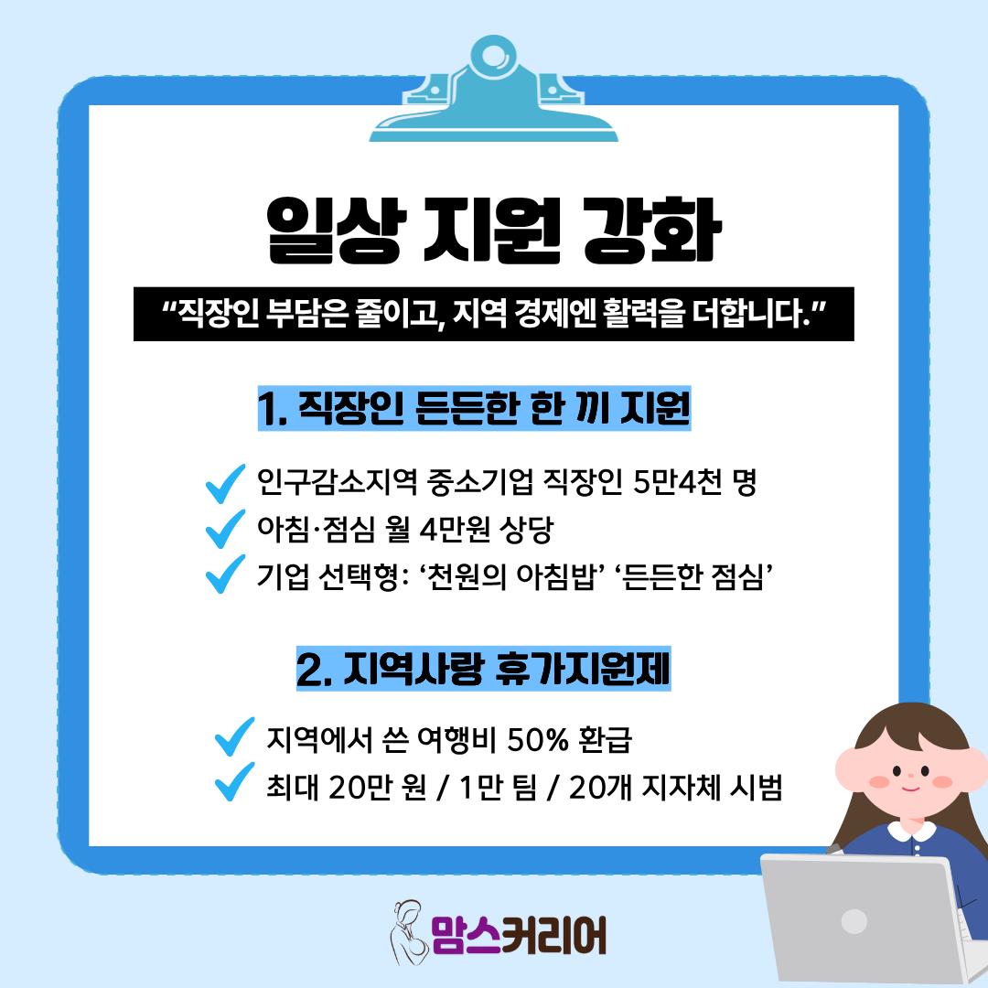 [맘스커리어 = 최영하 기자] 정부가 내년부터 식생활 여건이 취약한 직장인에게 식사 한끼를 지원하고, 인구감소지역 관광 활성화를 위해 20만 원 한도 내에서 여행경비 지출 금액의 절반을 지역사랑상품권으로 환급하는 지역사랑 휴가지원제를 20개 지자체에서 시범 실시한다.