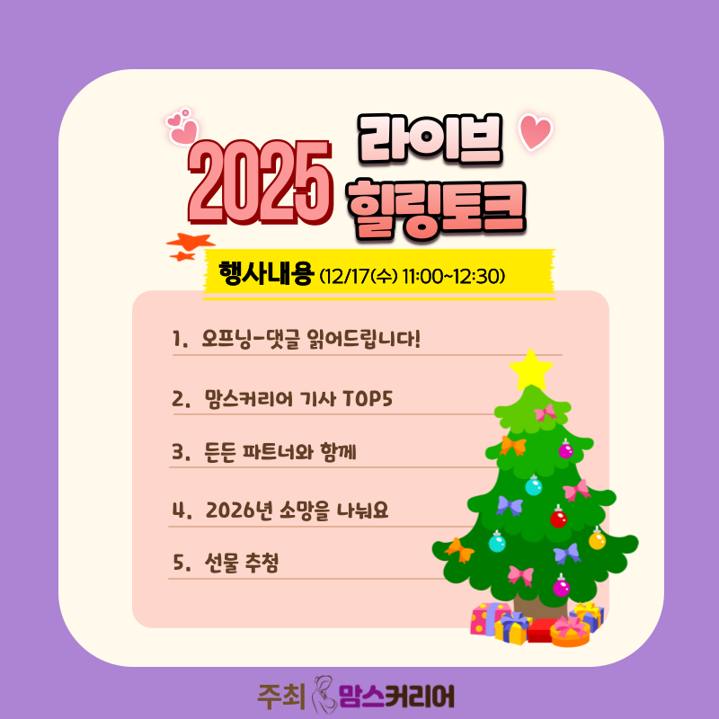 주요 프로그램은 △2025년 맘스커리어 기사 TOP5 소개 △든든 파트너와 함께하는 특별 코너 △2026년 새해 소망 나누기 △실시간 선물 추첨 등으로 구성됐다. 특히 올해 가장 사랑받았던 맘스커리어의 기사들을 모아 소개하는 '기사 TOP5' 코너는 엄마들이 어떤 이슈와 주제에 가장 공감했는지 돌아보는 시간이 될 것으로 보인다. 든든파트너 코너에서는 그동안 맘스커리어와 함께 임산부, 육아맘을 지원해온 기업의 담당자들이 출연해 임산부, 육아맘에게 유용한 제품들을 소개한다.