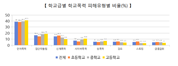 조사 결과를 자세히 살펴보면 피해 응답률은 2.5%로 2024년 1차 조사보다 0.4%p 증가했다. 학교급별로는 초등학교가 5.0%로 가장 높았으며 중학교 2.1%, 고등학교 0.7% 등 순으로 나타났다. 피해 유형별로는 △언어폭력(39.0%) △집단 따돌림(16.4%) △신체폭력(14.6%) △사이버 폭력(7.8%) △성폭력(6.0%) △강요(5.8%) △스토킹(5.3%) △금품 갈취(5.1%) 등 순으로 조사됐다. 모든 학교급에서 언어폭력의 비중이 가장 높게 나타났고 학교급이 높아질수록 언어폭력, 집단 따돌림, 사이버 폭력, 성폭력은 증가한 반면 신체폭력, 강요, 금품 갈취는 감소했다.