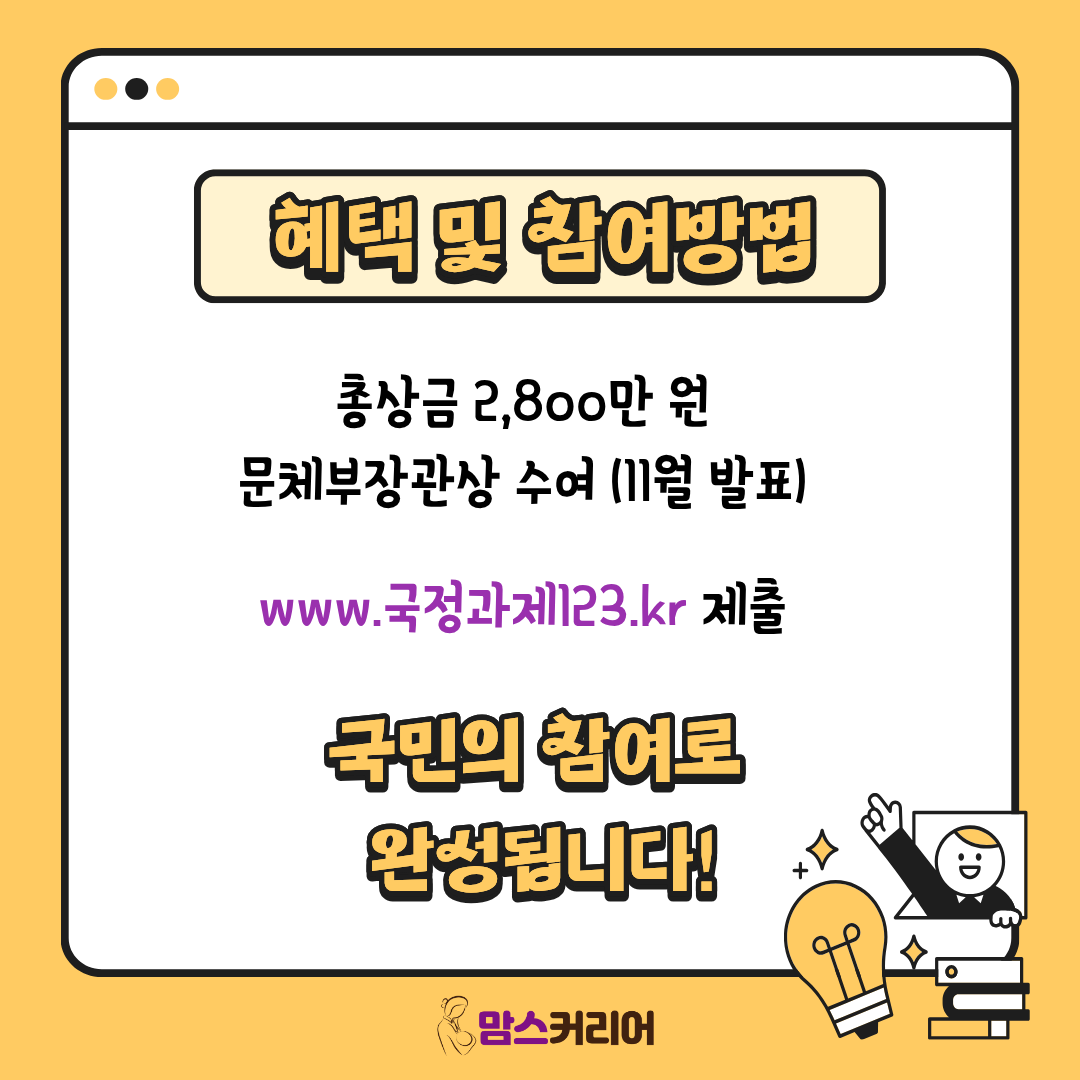 [맘스커리어 = 최영하 기자] 문화체육관광부가 국민과 함께 국가비전·국정목표를 완성하는 '내가 알리는 모두의 국정과제, 영상·디자인 공모전'을 개최한다.