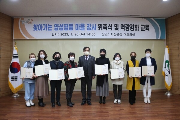 충남 서천군은 지난달 26일 군민을 대상으로 양성평등 정책에 대한 공감대 형성과 양성평등 문화 확산을 위한 교육을 진행하는 '양성평등 마을강사' 9명을 위촉했다. 이들은 모두 출산·양육 등으로 경력이 단절된 여성들이다.