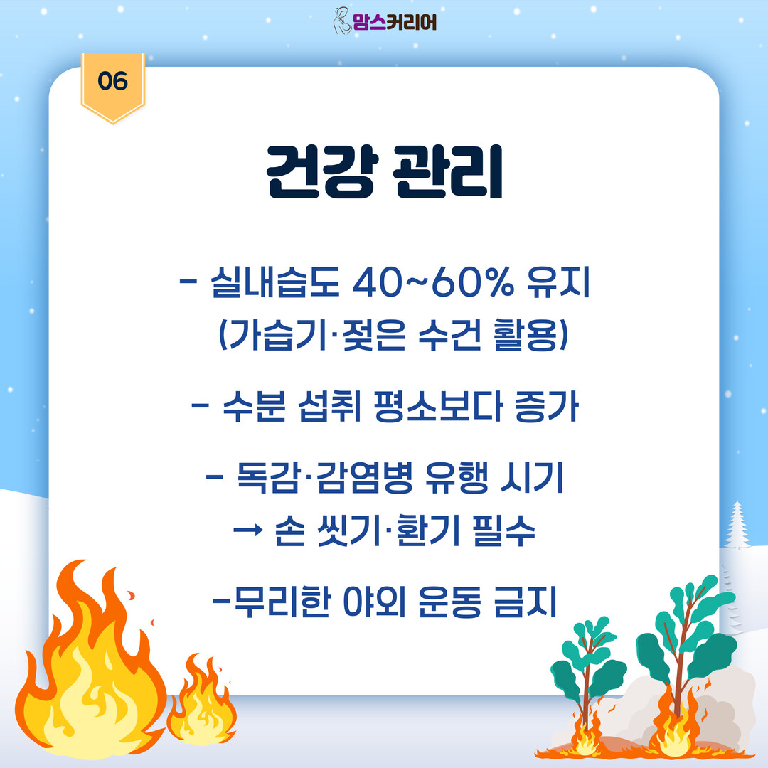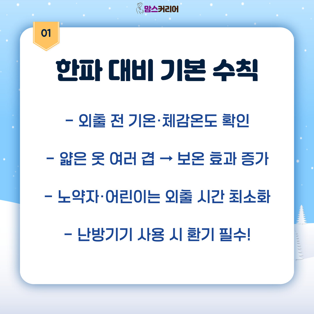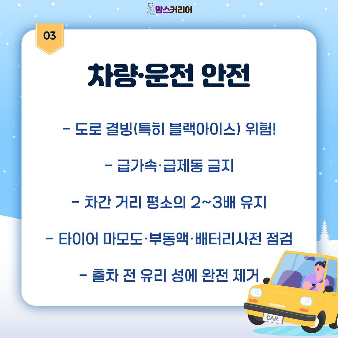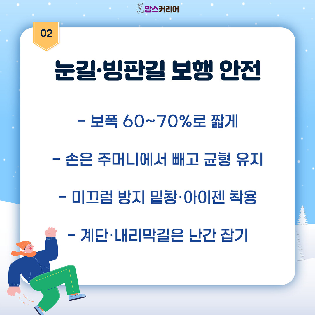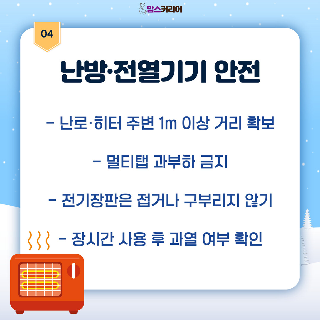 [맘스커리어 = 최영하 기자] 겨울철에는 기온 하강과 강설, 결빙 등으로 일상 속 안전사고 위험이 크게 높아진다. 빙판길 보행 중 넘어짐 사고, 눈길 차량 미끄러짐 사고, 난방기기 사용 증가에 따른 화재 위험까지 겹치며 겨울철은 어느 계절보다 각별한 주의가 필요한 시기로 꼽힌다. 특히 한파가 잦아지는 시기에는 작은 부주의 하나가 큰 사고로 이어질 수 있어, 사전 예방과 안전 수칙 준수가 더욱 중요해지고 있다.