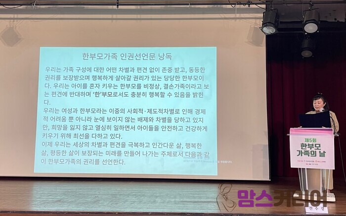 | ▲ 이임조 부산한부모가족센터 대표가 한부모가족 인권선언문을 낭독하고 있다.[사진=김혜원 기자] |