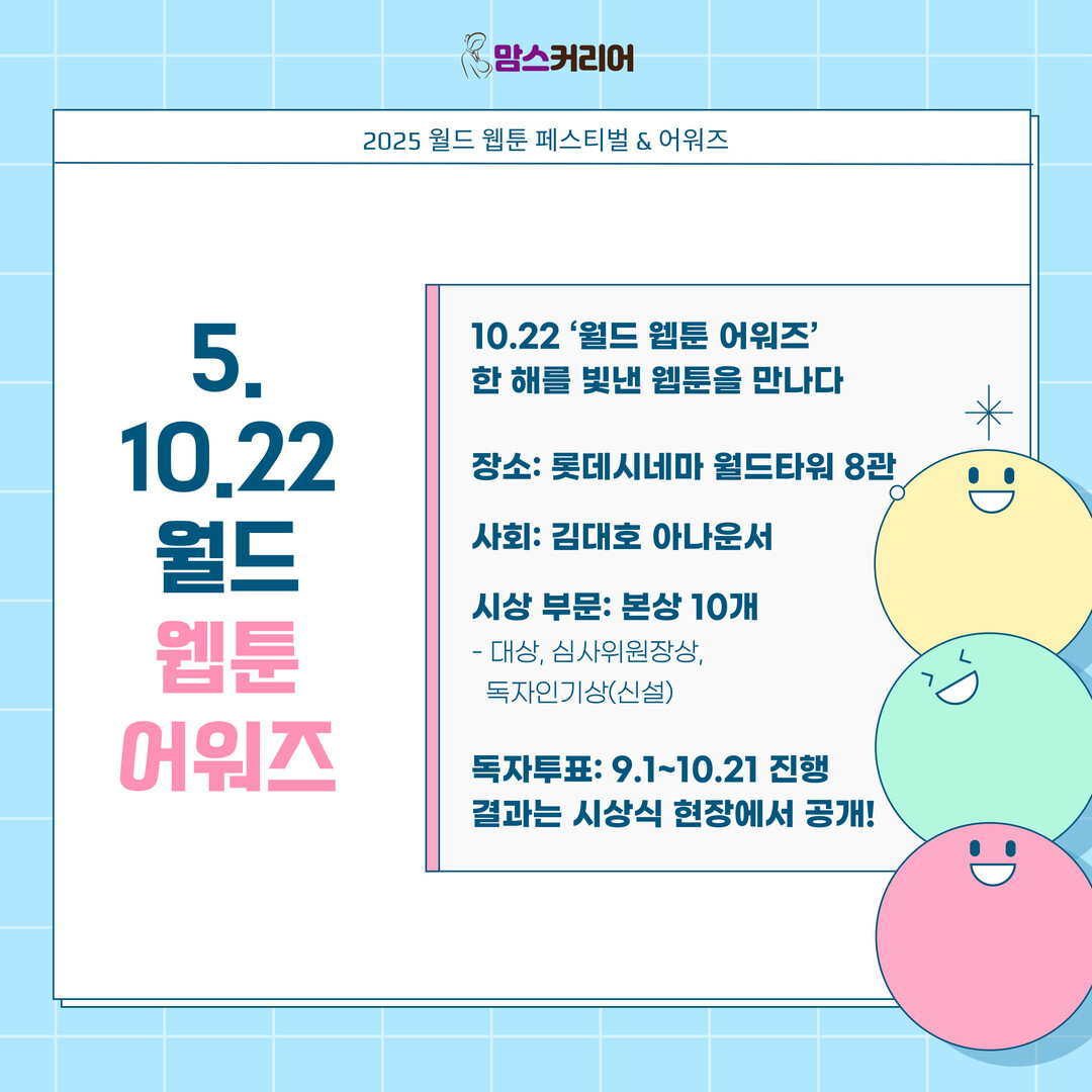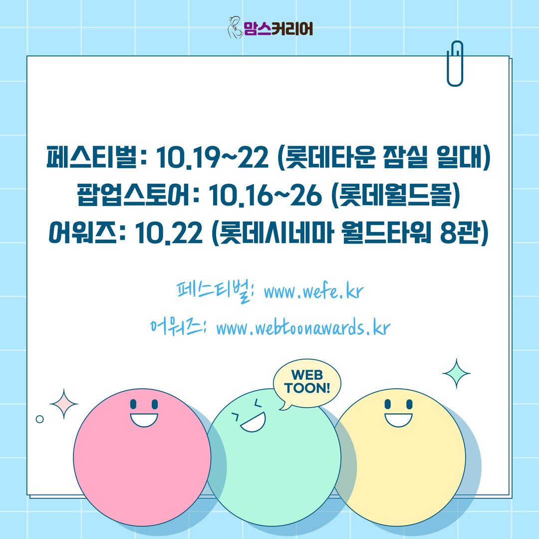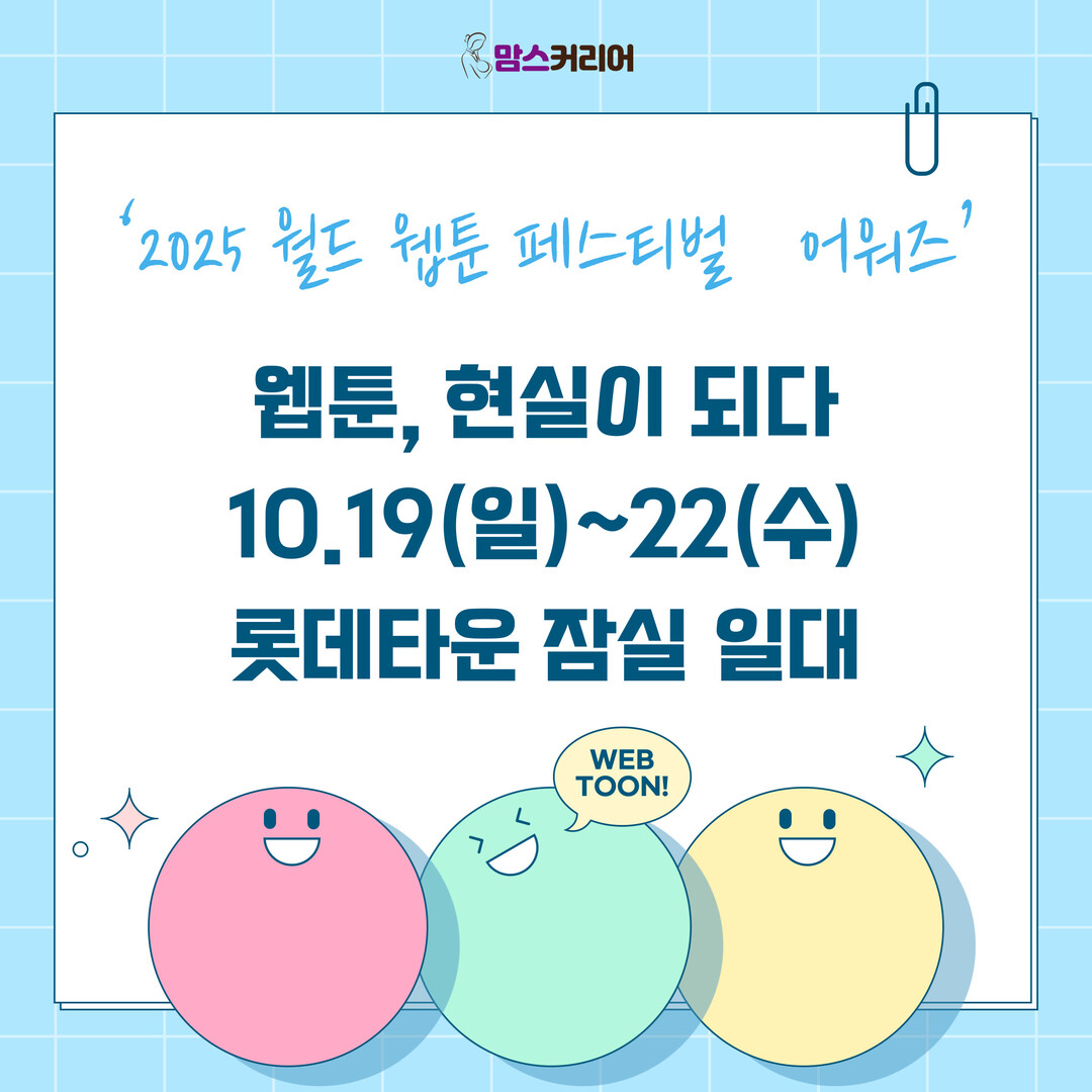 [맘스커리어 = 오재옥 엄마기자] 문화체육관광부는 한국콘텐츠진흥원과 함께 10월 19일부터 22일까지 롯데타운 잠실 일대에서 ‘2025 월드 웹툰 페스티벌’을 개최하고 축제 마지막 날인 22일에는 ‘2025 월드 웹툰 어워즈 시상식’을 진행한다.