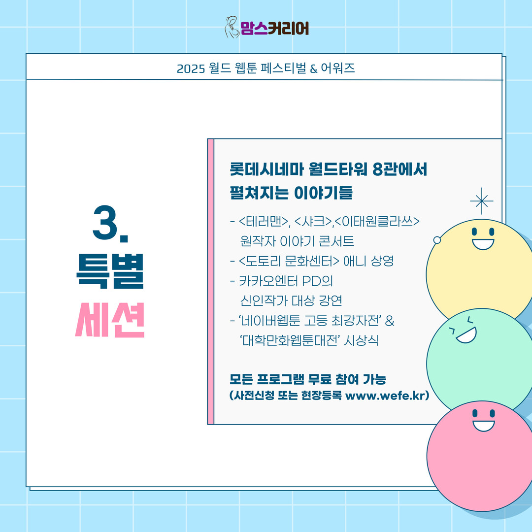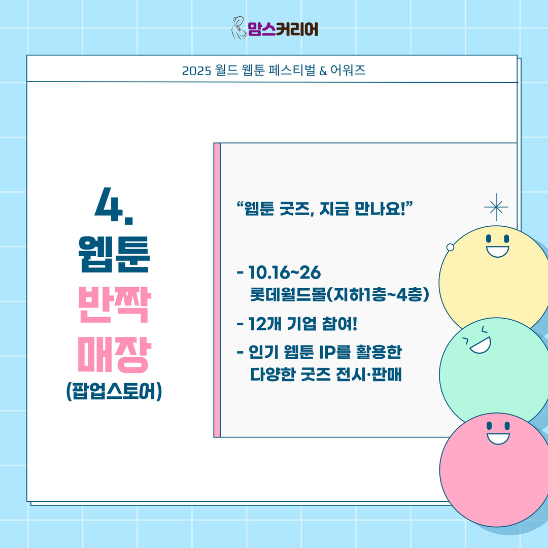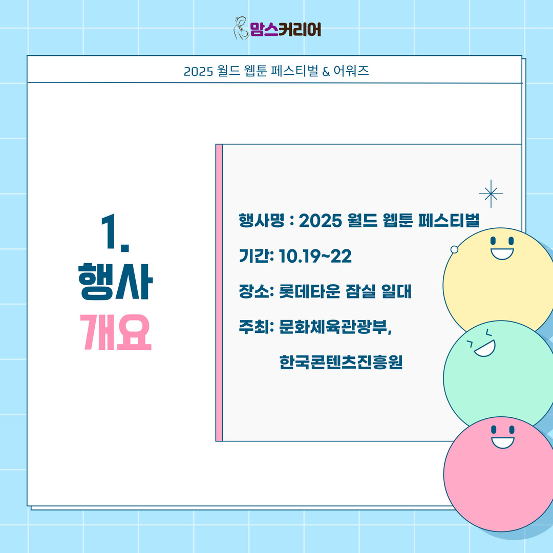 [맘스커리어 = 오재옥 엄마기자] 문화체육관광부는 한국콘텐츠진흥원과 함께 10월 19일부터 22일까지 롯데타운 잠실 일대에서 ‘2025 월드 웹툰 페스티벌’을 개최하고 축제 마지막 날인 22일에는 ‘2025 월드 웹툰 어워즈 시상식’을 진행한다.