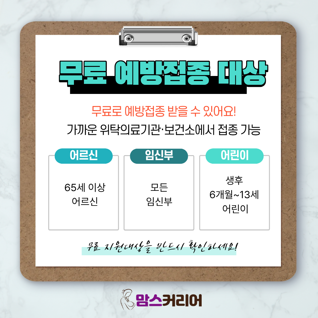 질병청은 현재 '25-26절기 인플루엔자 국가예방접종'을 시행 중이다. 접종 대상은 생후 6개월~13세 어린이(2012.1.1~2025.8.31. 출생자), 임신부, 65세 이상 어르신(1960.12.31. 이전 출생자)이다. 생후 6개월 이상 13세 어린이 중 과거 접종력이 없거나 기존에 1회만 접종 받은 6개월 이상 9세 미만 유아·어린이는 2회 접종 대상이며 위 조건 이외의 어린이는 1회 접종 대상이다.