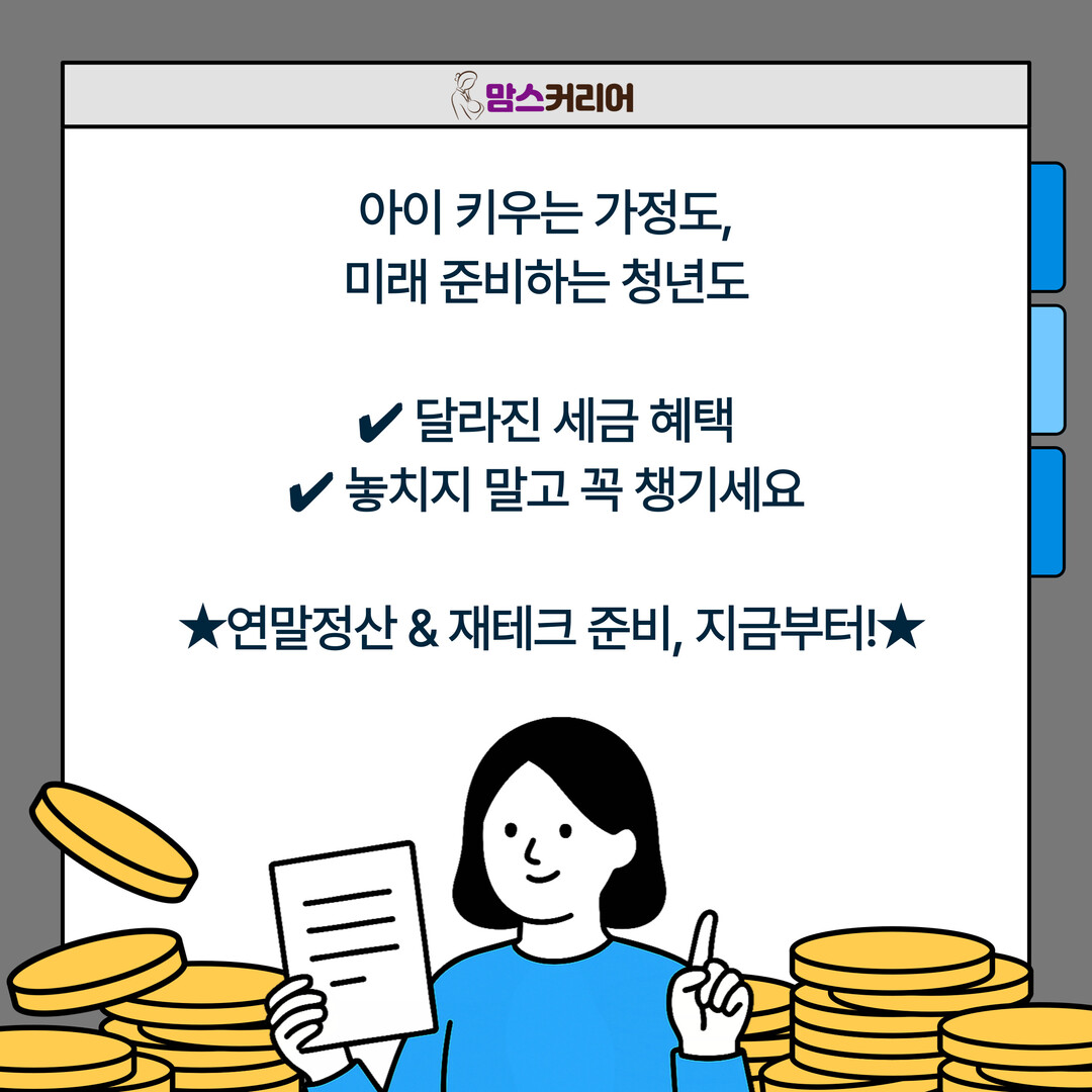 [맘스커리어 = 최영하 기자] 새해를 맞아 자녀 양육 부담을 덜고 청년의 자산 형성을 지원하는 세제 혜택이 대폭 확대된다.