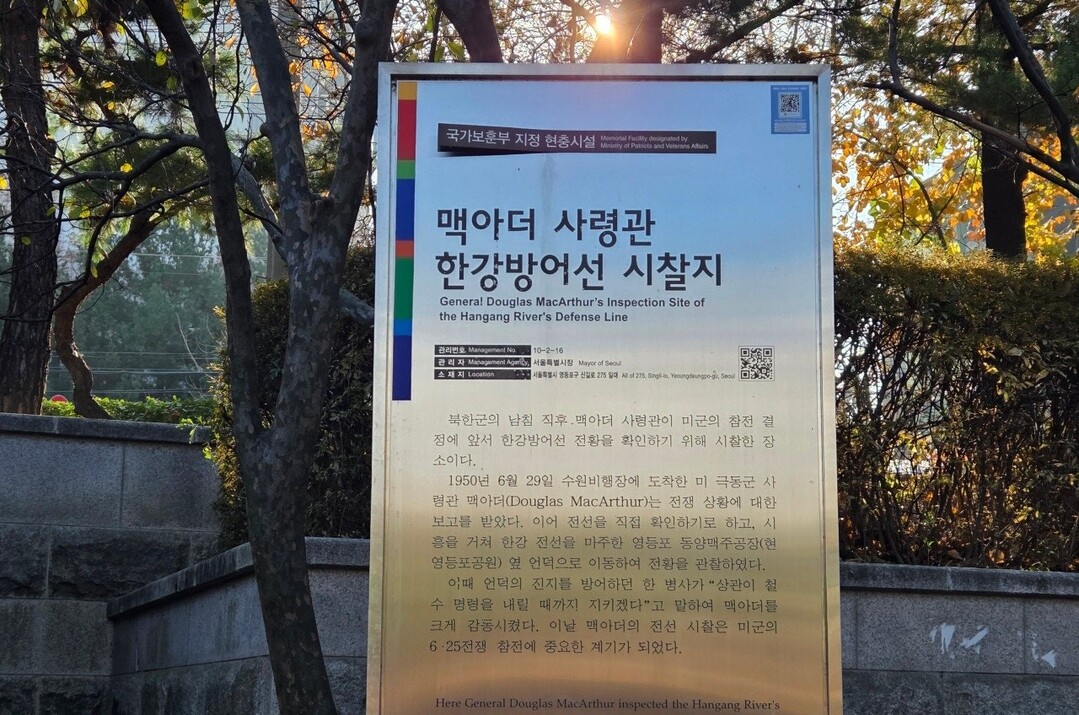 | ▲맥아더 사령관 한강 방어선 시찰지, 영등포공원 이곳이 북한군의 남침 직후 맥아더 사령관이 미군의 참전 결정에 앞서 한강방어선 전황을 확인하기 위해 시찰한 장소이다.[사진=김복희 엄마기자] |