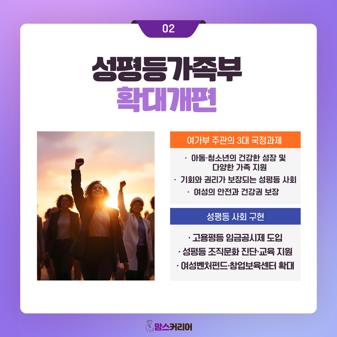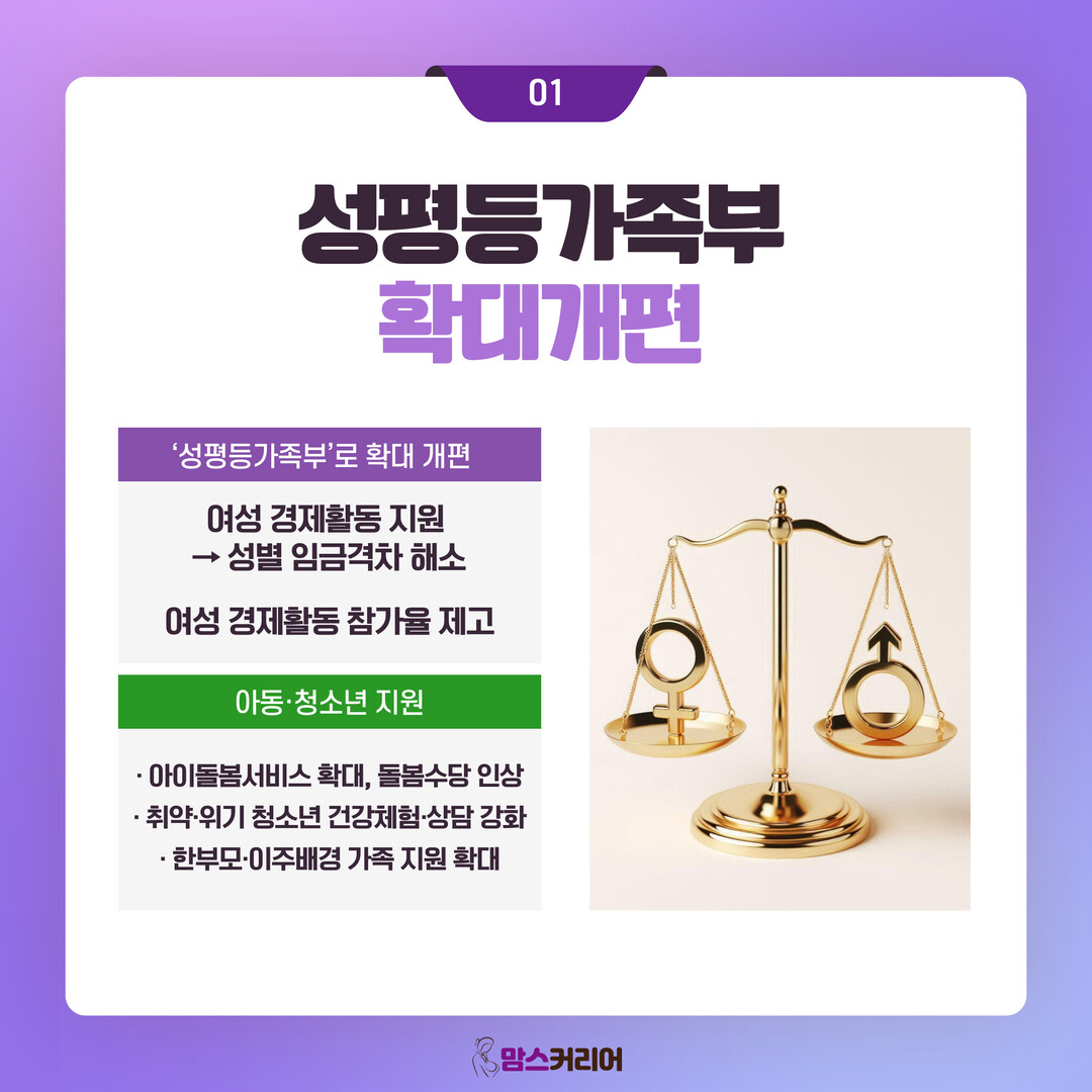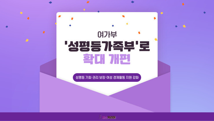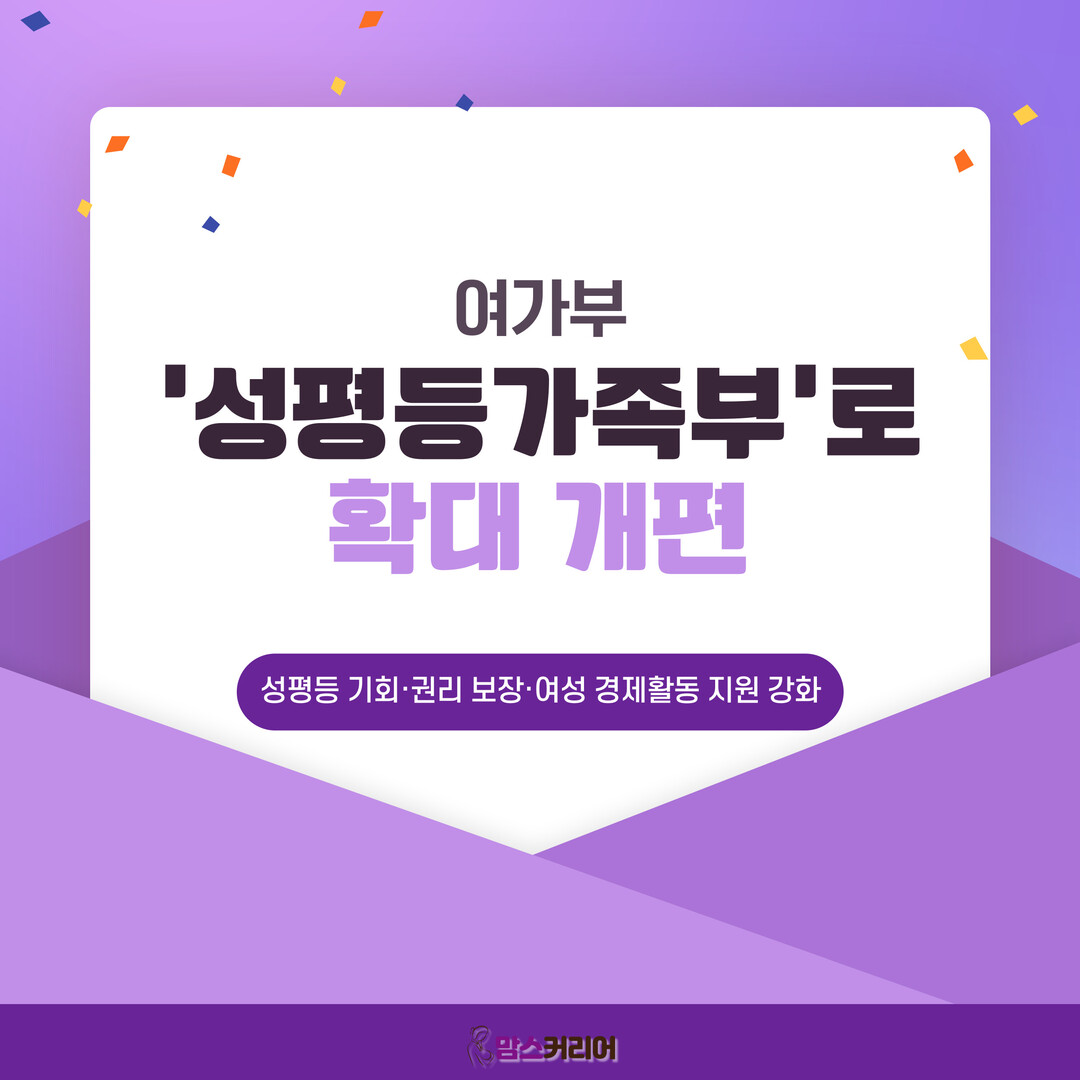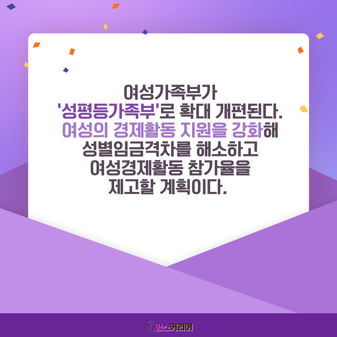 [맘스커리어 = 오재옥 엄마기자] 여성가족부가 '성평등가족부'로 확대 개편된다. 여성의 경제활동 지원을 강화해 성별임금격차를 해소하고 여성경제활동 참가율을 제고할 계획이다.