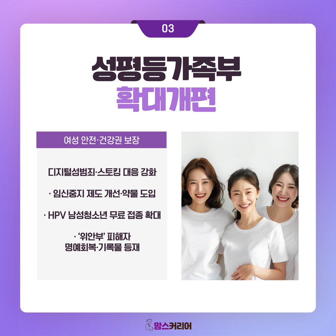여가부 주관의 국정과제는 △아동·청소년의 건강한 성장 및 다양한 가족 지원 △기회와 권리가 보장되는 성평등 사회 △여성의 안전과 건강권 보장 등 3대 과제다.
