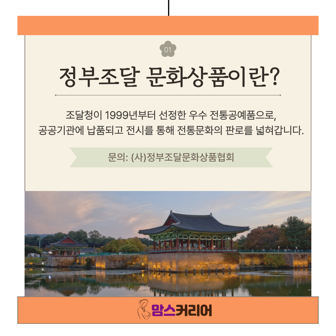 조달청은 1999년부터 우수한 전통공예품을 ‘정부조달문화상품’으로 선정해 나라장터 종합쇼핑몰을 통해 공공기관에 공급하고 있으며, 전시회와 판로 지원을 통해 전통문화상품의 활성화를 돕고 있다.