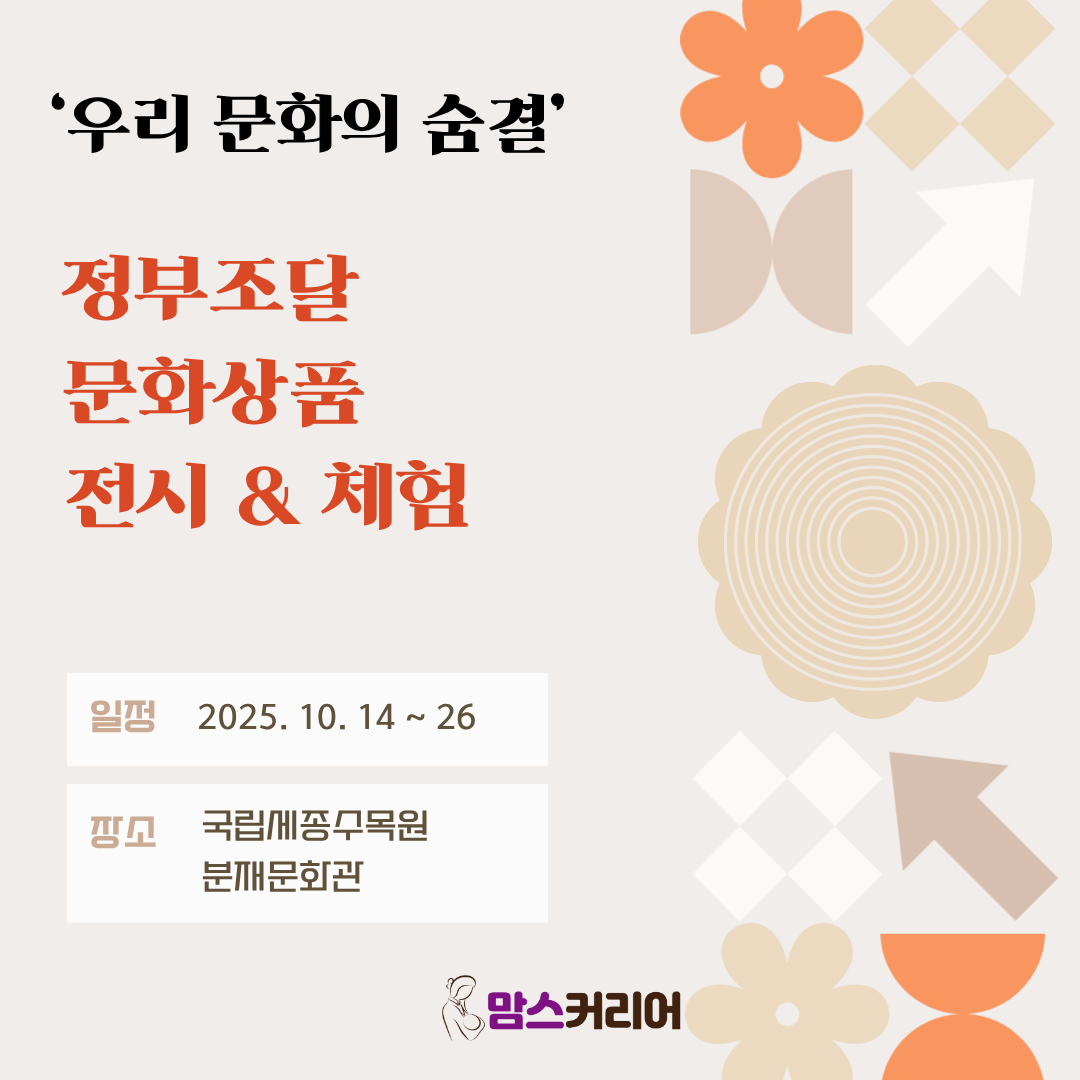 [맘스커리어 = 최영하 기자] 조달청은 국립세종수목원, (사)정부조달문화상품협회와 함께 이달 14일부터 26일까지 국립세종수목원 분재문화관에서 ‘우리 문화의 숨결’ 특별전시를 개최한다. 이번 전시는 정부조달 문화상품을 국민에게 널리 알리고, 가을 정취 속에서 전통문화를 직접 보고 즐기며 체험할 수 있도록 마련됐다.