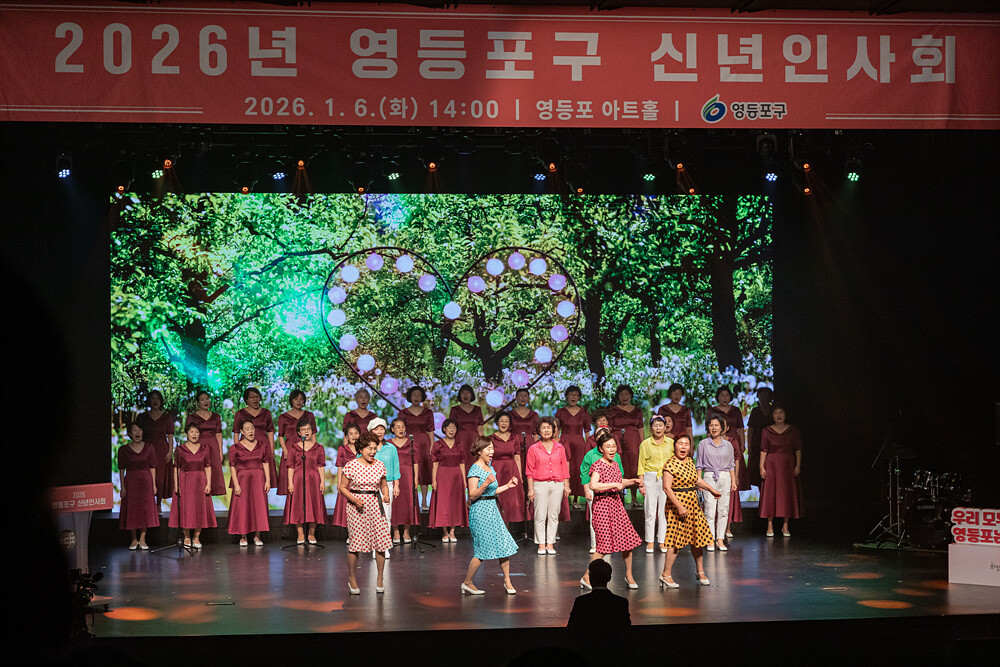 마지막 순서로는 '응답하라! 젊은 영등포'를 주제로 한 축하공연이 진행됐다. 영등포청년밴드는 '사랑의 배터리'와 '여행을 떠나요' 등을 부르며 객석의 흥을 돋웠고 영등포시니어합창단은 아름다운 하모니로 박수와 환호를 이끌어냈다. 한편 영등포구는 이번 신년인사회를 시작으로 2026년에도 구민과의 직접 소통을 강화하고 구민들이 체감할 수 있는 정책을 지속 추진할 방침이다.