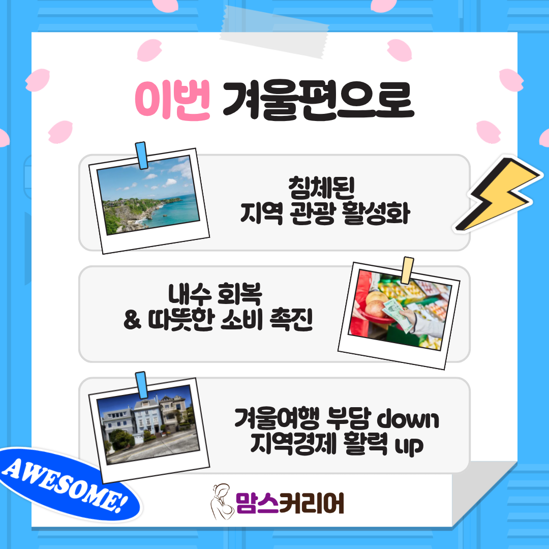 이번 '겨울편'은 수도권(서울·경기·인천)을 제외한 비수도권 숙박시설을 대상으로 하며, 숙박요금 7만 원 이상 상품은 3만 원, 7만 원 미만 상품은 2만 원의 할인권이 적용된다. 할인권은 행사 기간 내 입실하는 호텔·리조트·콘도·펜션 등 등록 숙박시설 예약 시 사용할 수 있다. 단, 대실 상품이나 미등록 숙박시설은 제외된다.