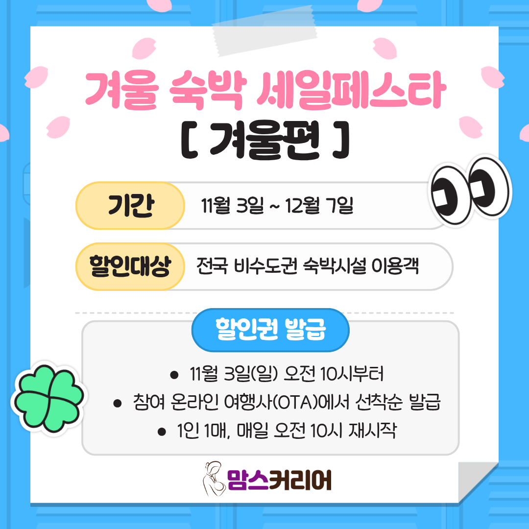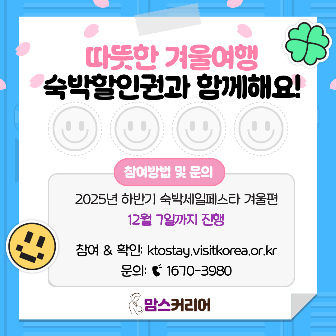 [맘스커리어 = 최영하 기자] 문화체육관광부는 한국관광공사와 함께 오는 12월 7일까지, '2025년 하반기 숙박세일페스타 겨울편'을 추진한다. .