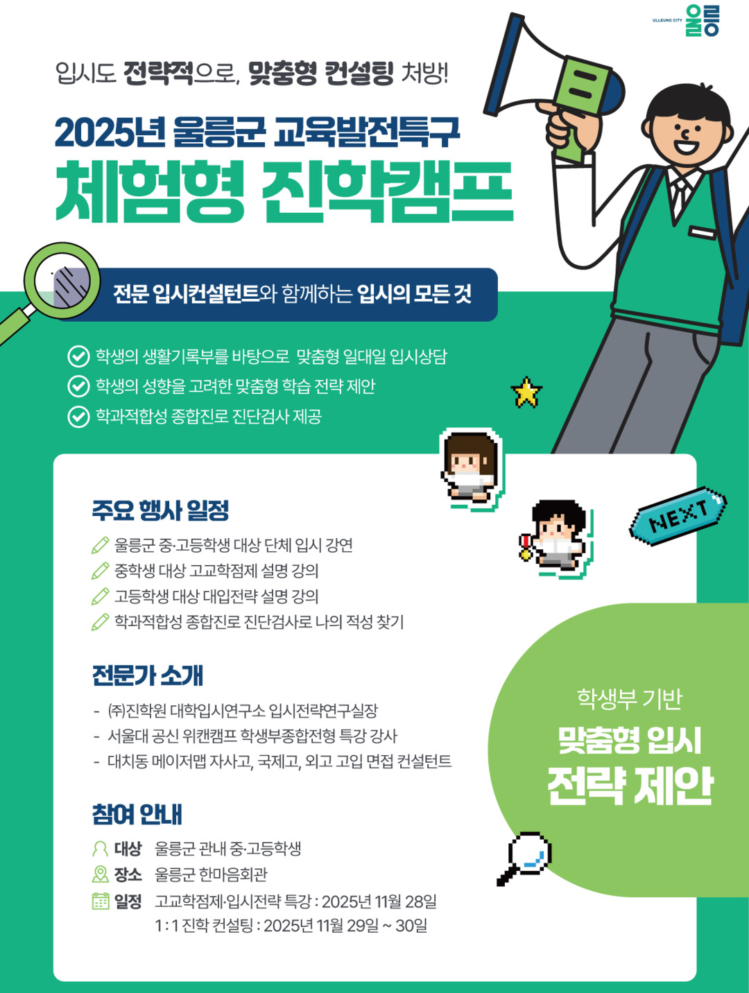 울릉군은 도서지역 학생들의 정보 접근 한계를 줄이기 위해 지난 28~30일 사흘간 체험형 진학캠프를 운영했다. 울릉중·울릉고 학생을 대상으로 고입·대입 전략 설명회를 열고, 지역 최초 1대1 맞춤형 입시컨설팅도 진행했다. 서울 대치동에서 활동하는 입시 강사들이 울릉도를 찾았다. 남한권 울릉군수는 “도서지역 학생들도 육지와 동일한 수준의 입시 정보를 받을 수 있도록 지원을 확대하겠다”고 말했다.